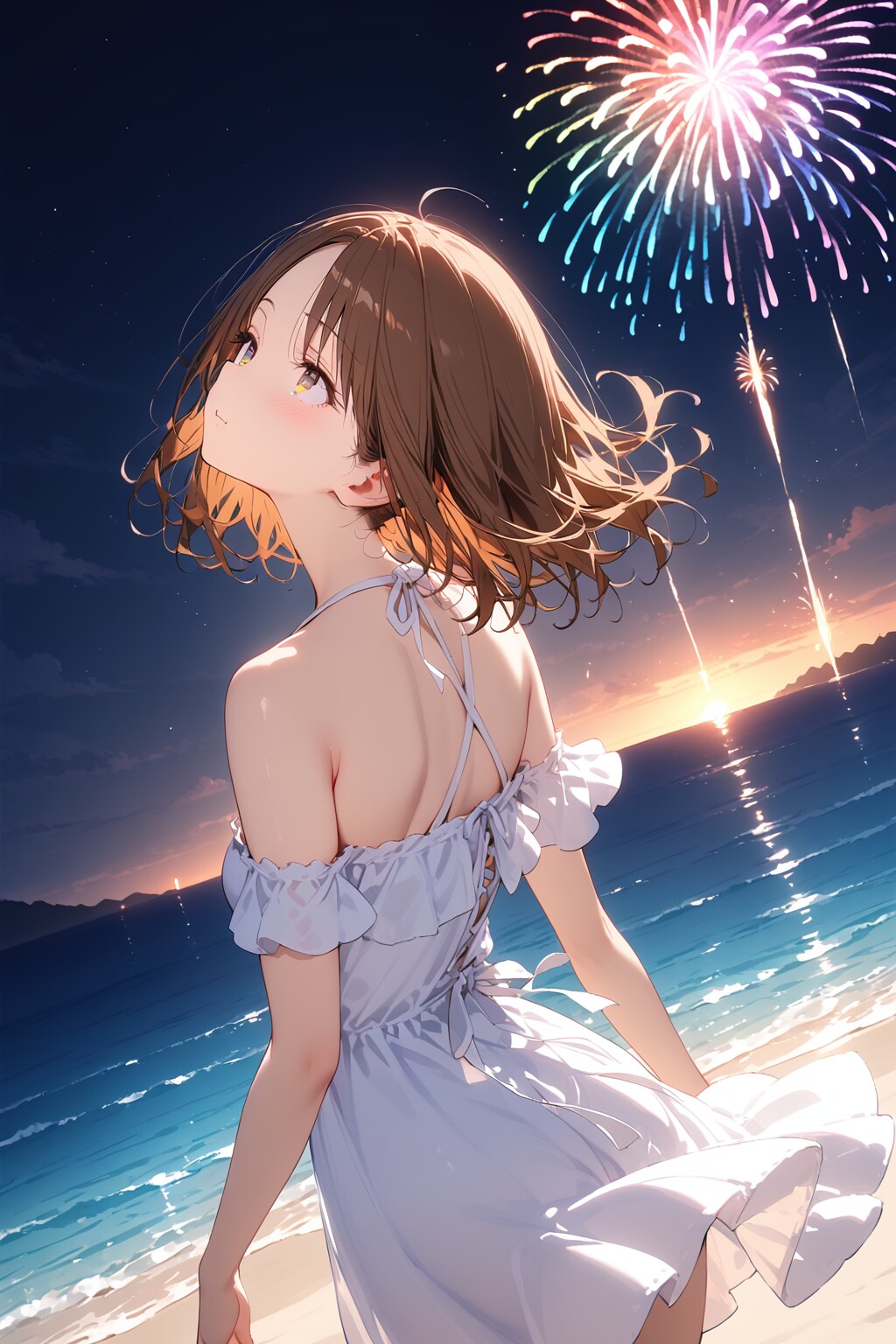 1枚目を最初に生成してみたんですが、花火の指定を強くしすぎました。2枚目以降が調整後。