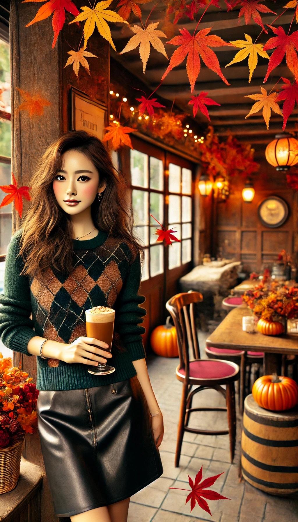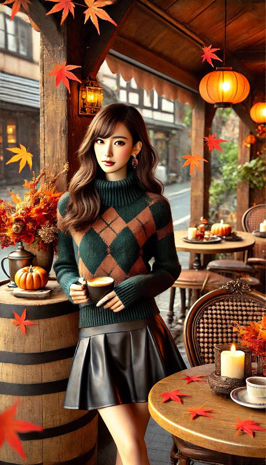 ダークグリーンとブラウンのアーガイルチェック柄のセーターを、タイトなレザースカートと組み合わせます。足元はアンクルブーツで、アクセントにゴールドのネックレスをプラスすると、クラシカルかつ大人っぽい秋のスタイルになります。