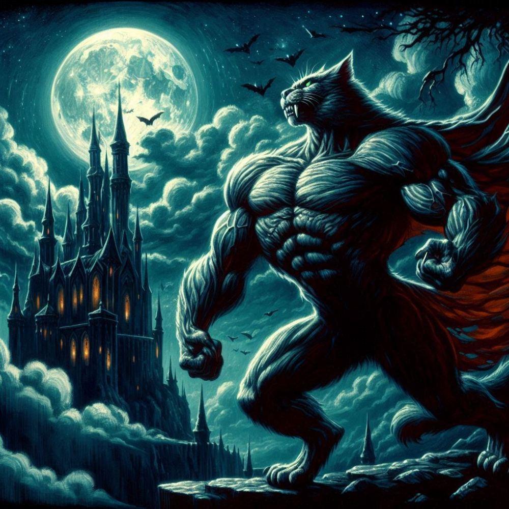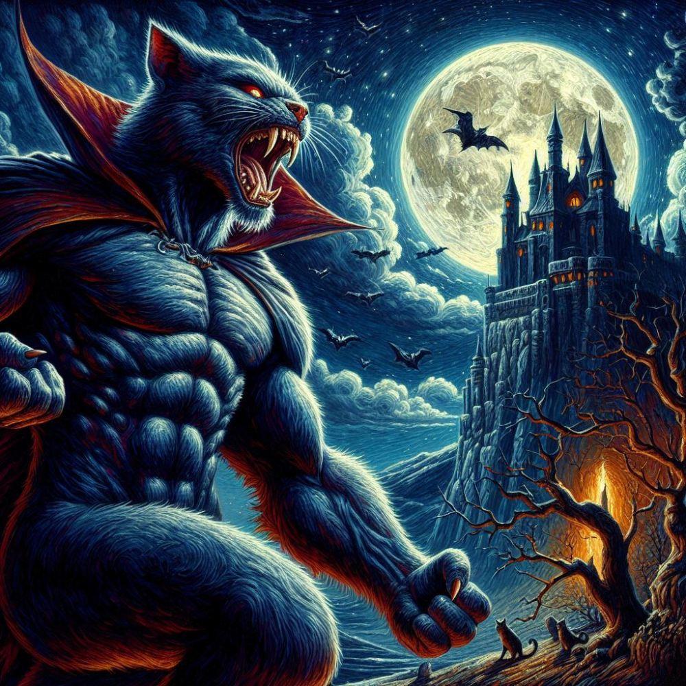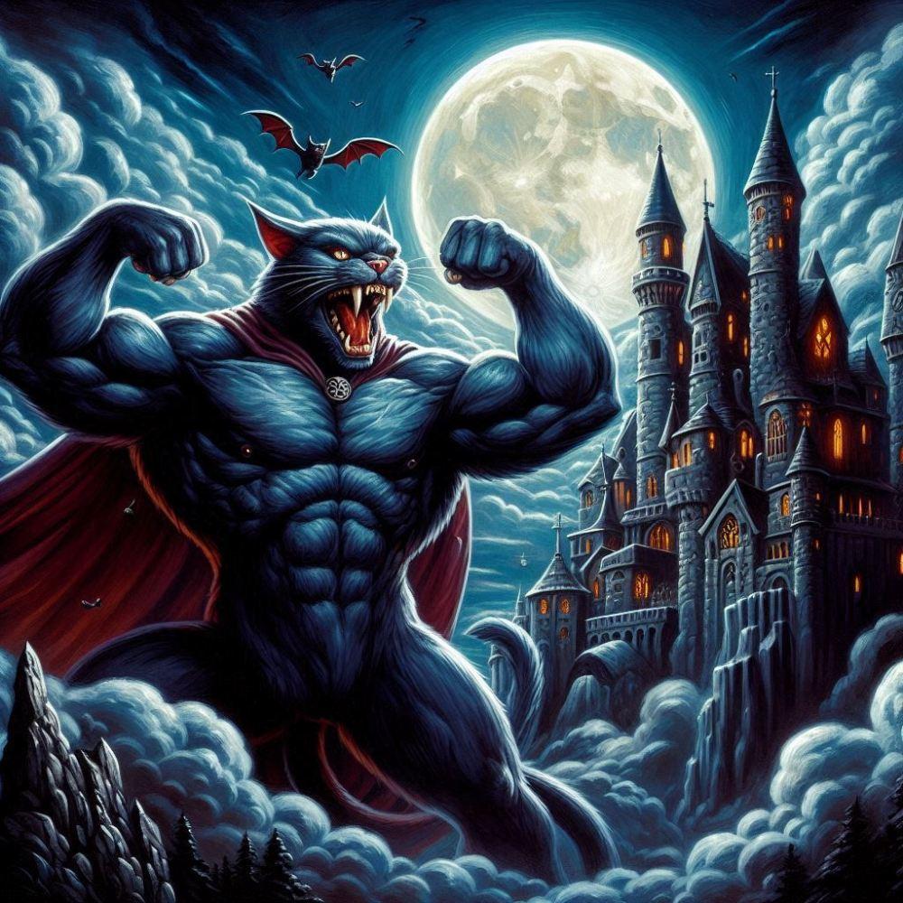 アクリルファンタジーホラー、牙を見せる吸血鬼筋肉猫