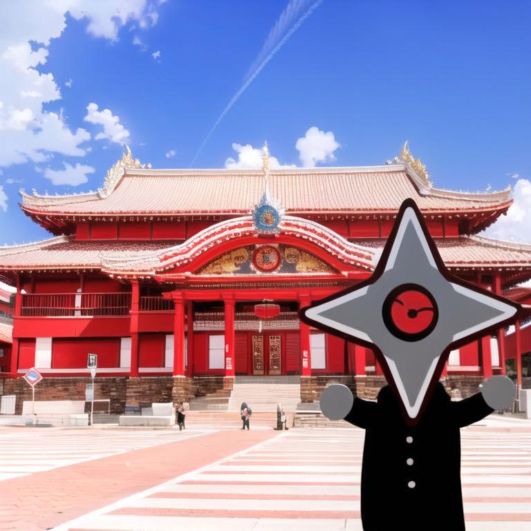 ※パブリックドメインの首里城と、パブリックドメインの手裏剣、手書きした身体をペイントソフトで結合してからi2iしたものなので、AIイラストという観点からは大分レッドカード寄りです許してちょんまげ