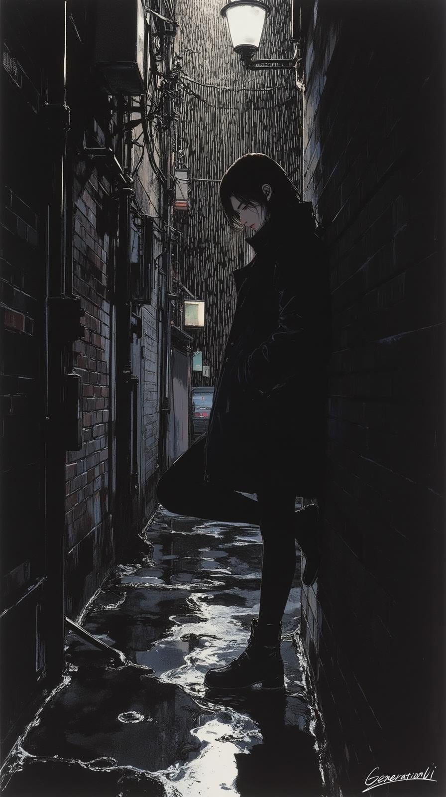 路地の隅、壁にもたれた彼女は、