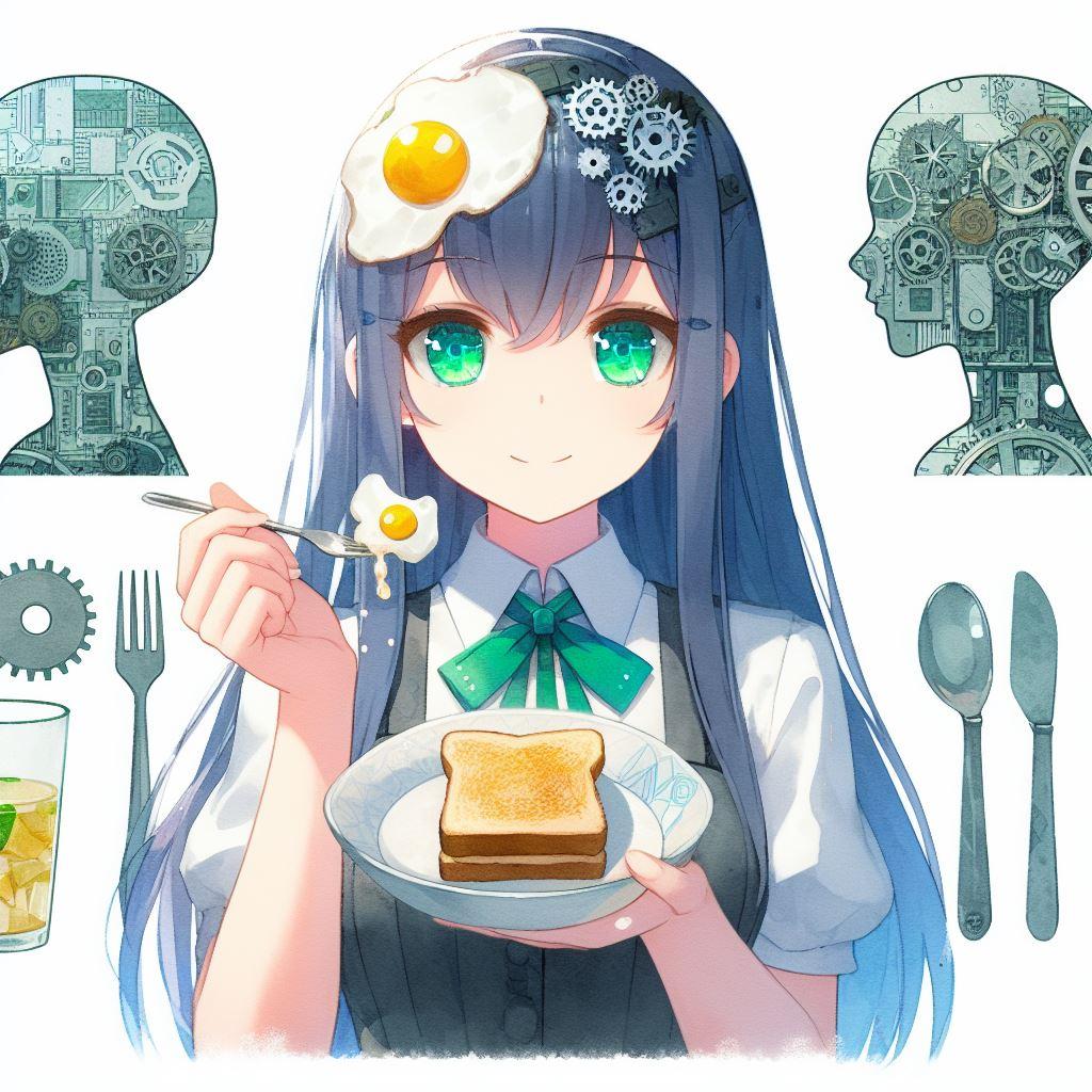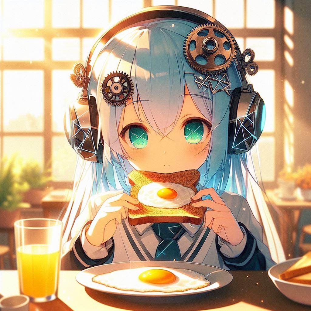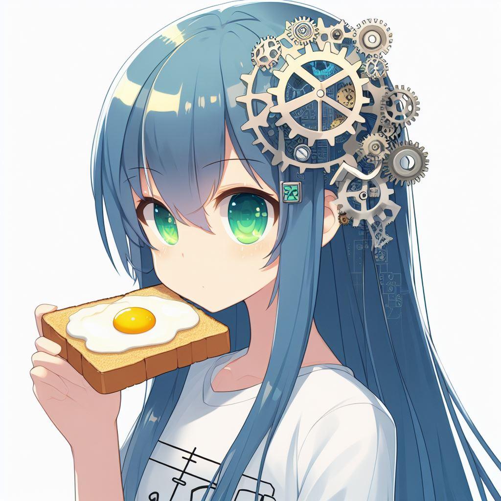 最初は「卵焼きの乗ったパンを食べる歯車むすめ」だけ(2~4枚目)で生成したもの。