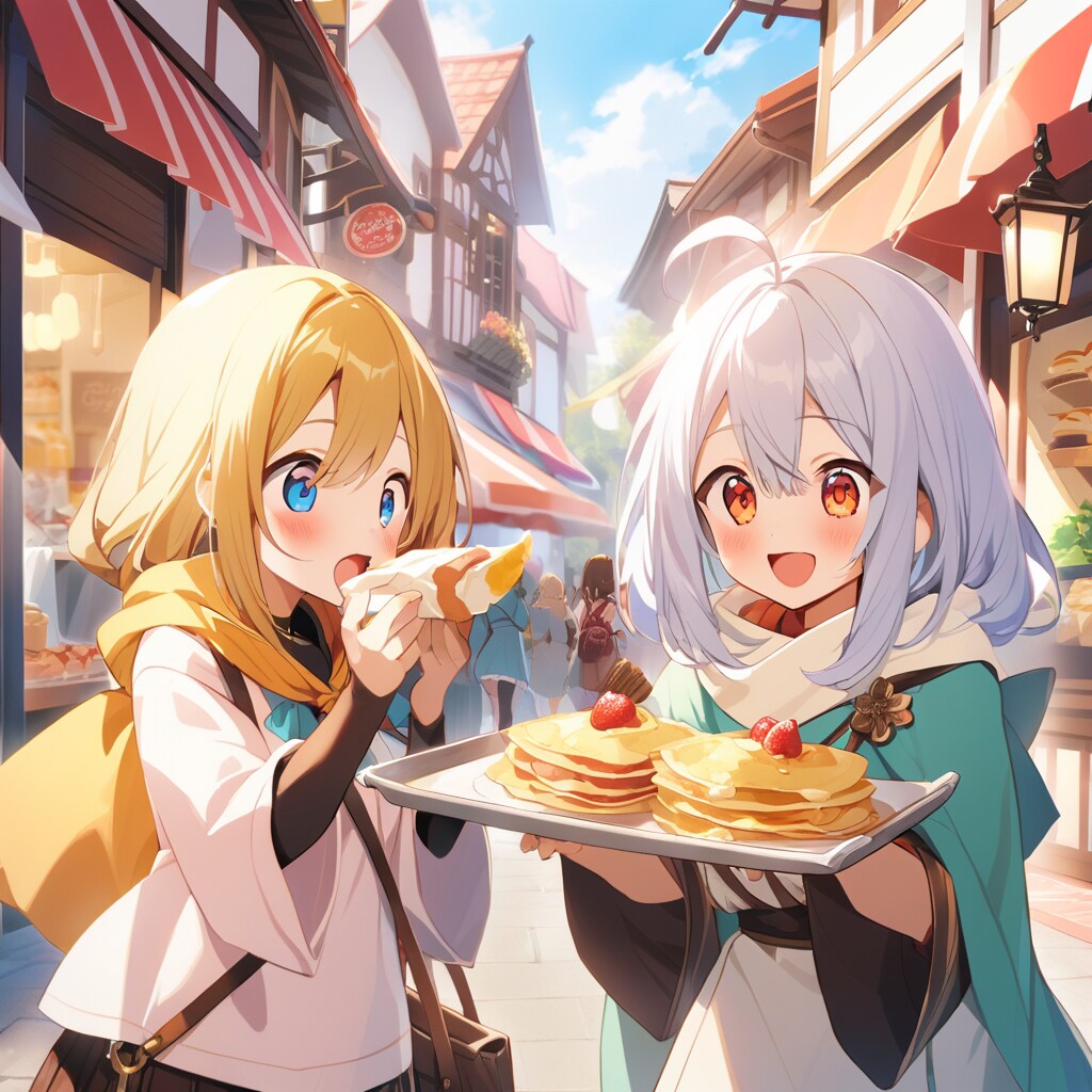 クレープを買い食いしている子供ペコリーヌとコッコロ