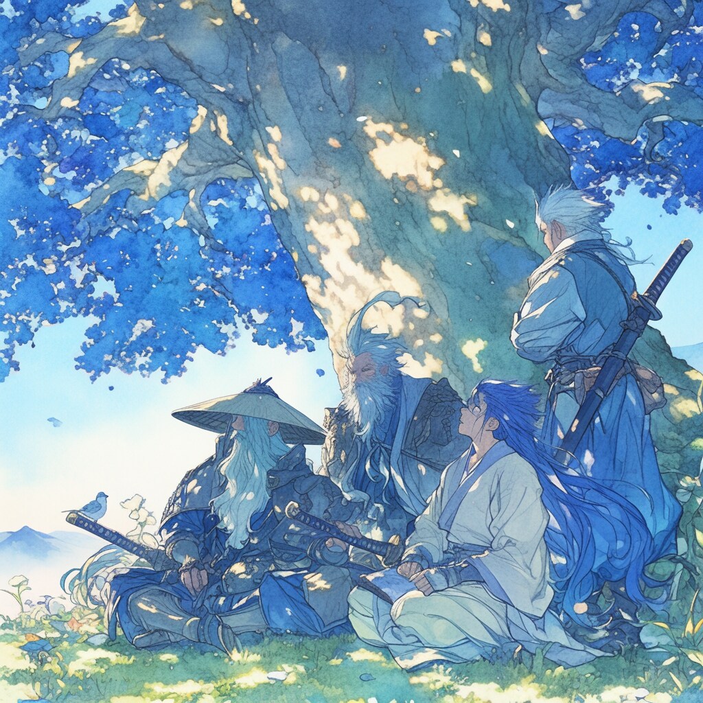 お付きの爺様と若御一行 雨宿りから晴れた図