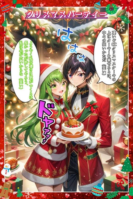 CC「そんなことを言うな、ルルーシュ。このターキーが加わることで、ケーキに新しい風味が生まれるんだ!クリスマスなのだから、少しは冒険してみてもいいと思わないか?」