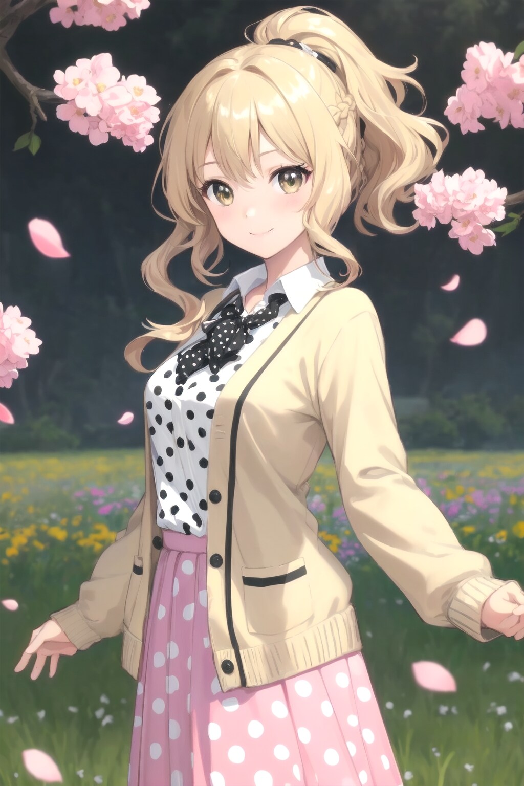 白黒水玉模様のブラウスにベージュのカーディガン、ピンク水玉のロングスカートに季節の花を添えて。