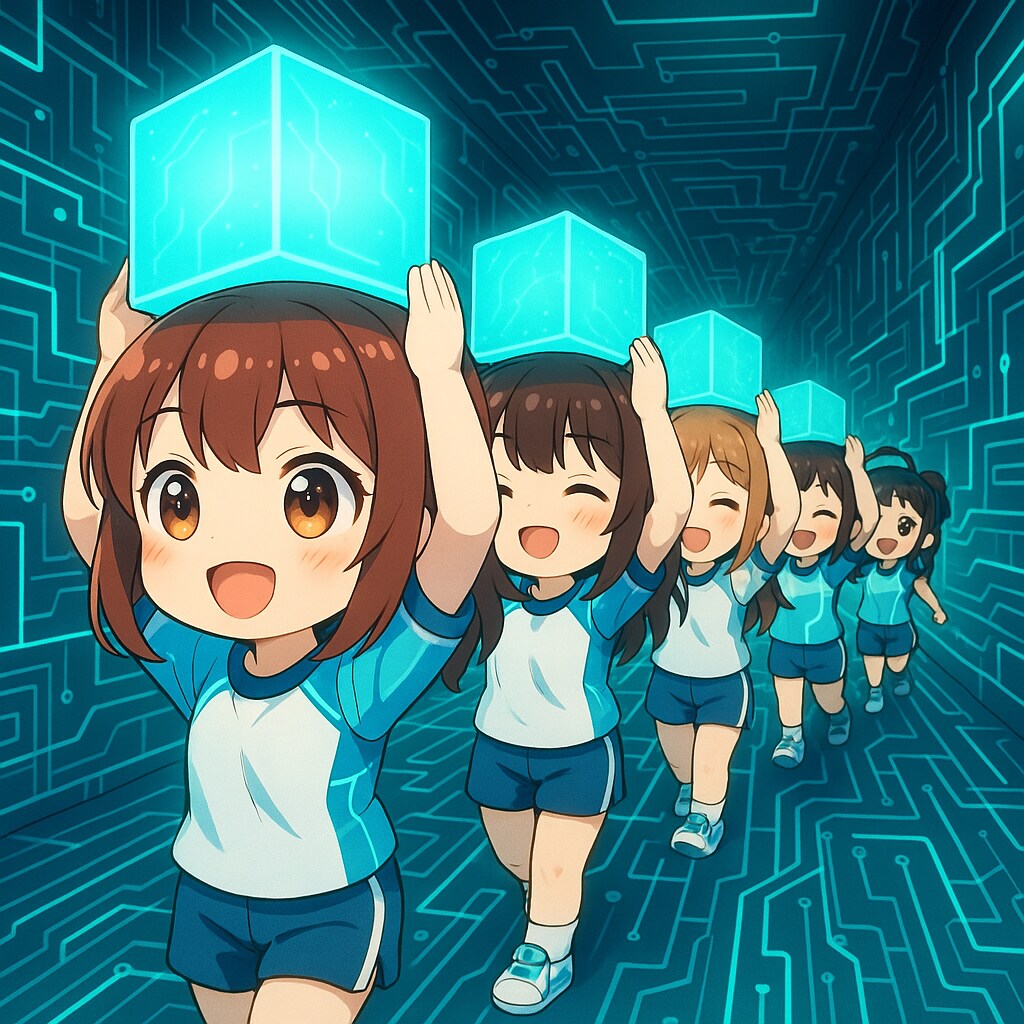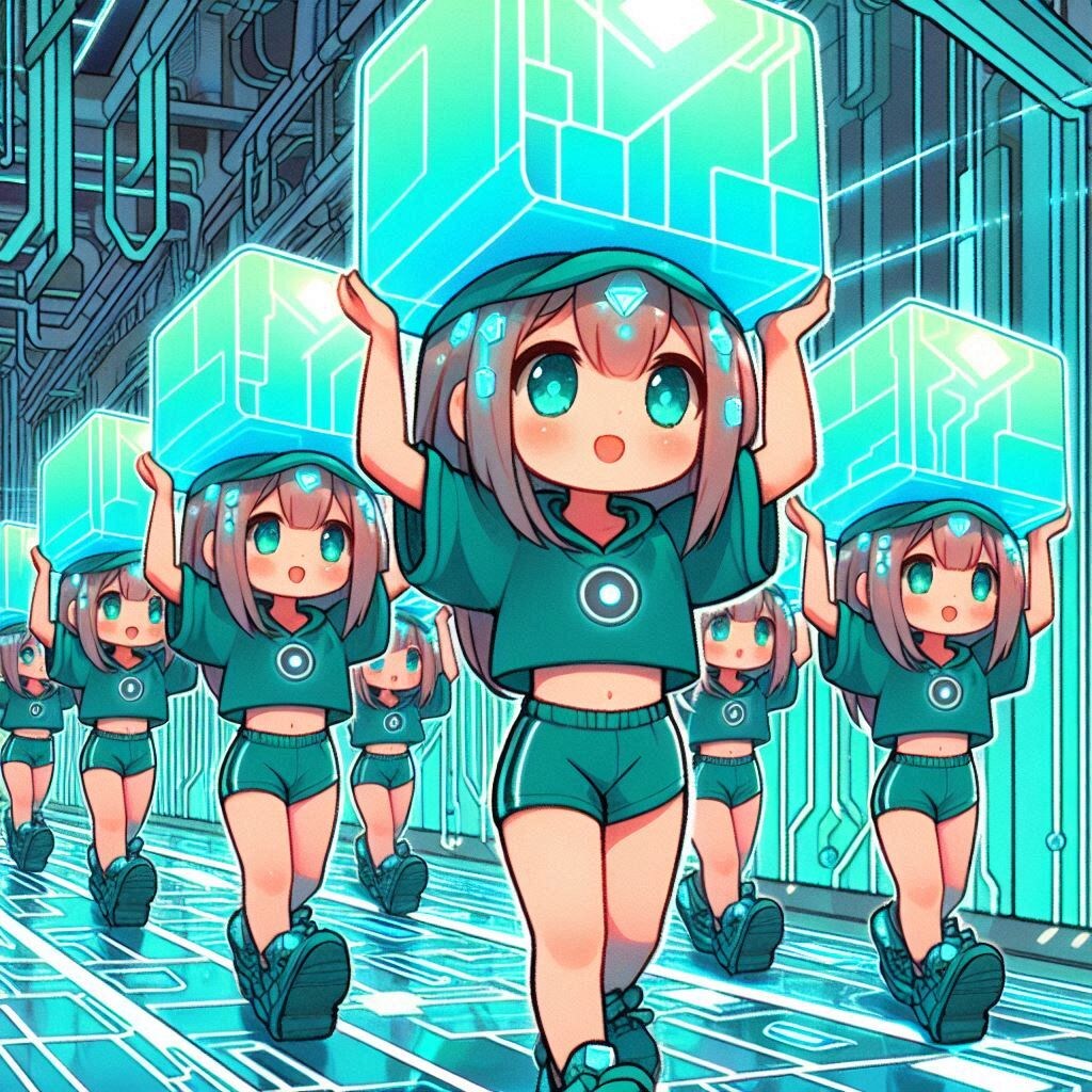 anime-illust, cute, happy, circuit pattern corridor, procession of Chibi-chans in cyber gym clothes holding and carrying glowing aquamarine cubes on their heads.
