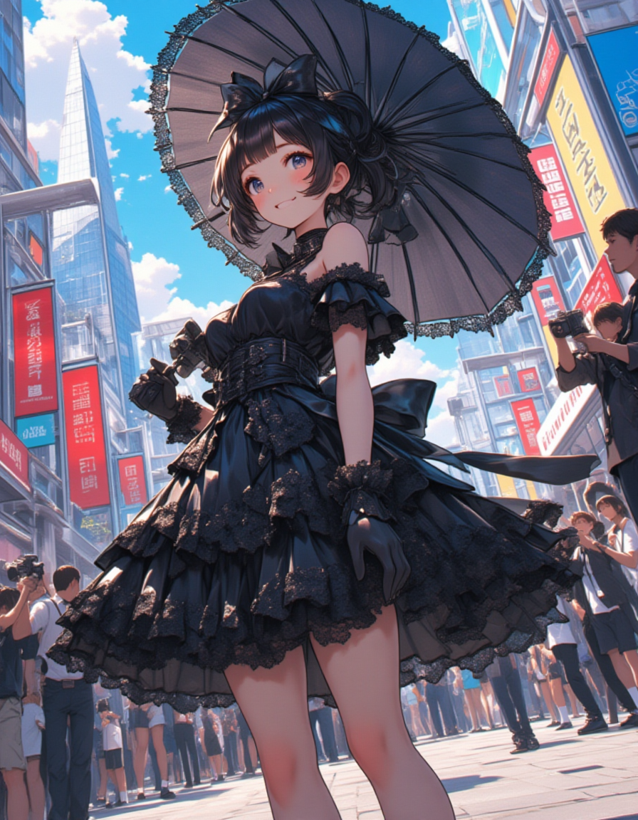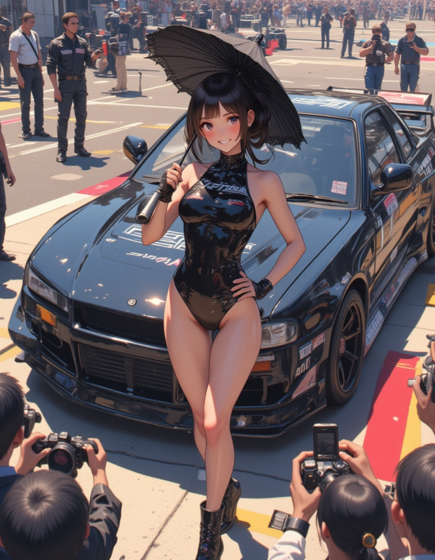 A sleek and bold palette dominated by deep blacks from the leotard and Skyline R32,accented by subtle silvers and whites in the sponsor logos and parasol lace. The racetrack’s asphalt grays and grandstand silvers blend with warm sunlight tones,creating a dynamic and glamorous scene with a cohesive,monochromatic focus.Style:,