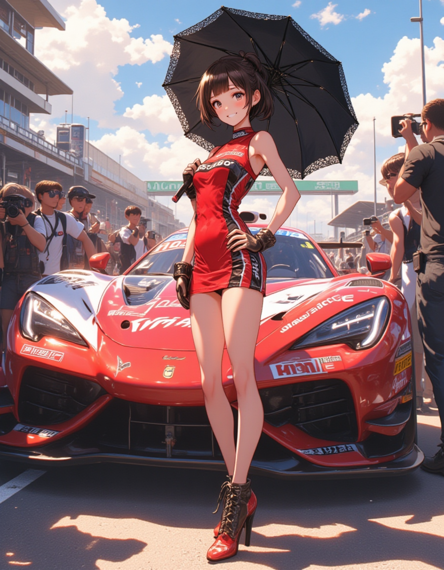 Masterpiece quality,ultra-detailed 16K CG art,anime-inspired with sharp lines and flawless,smooth skin. The style incorporates subtle sound effects (e.g., camera shutters, distant engine revs) and dynamic motion lines to emphasize the high-energy atmosphere of the race venue photography session.Composition:,