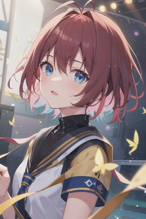 髪型は赤色、ショートカット、ショートボブ、目はタレ目で水色