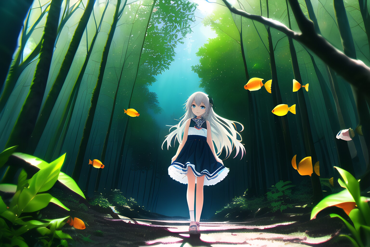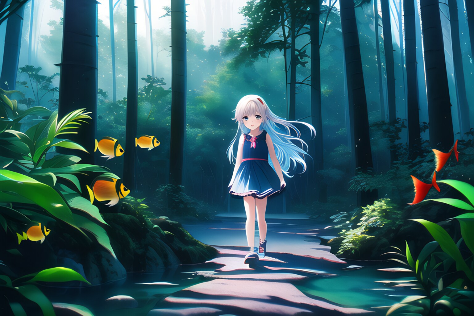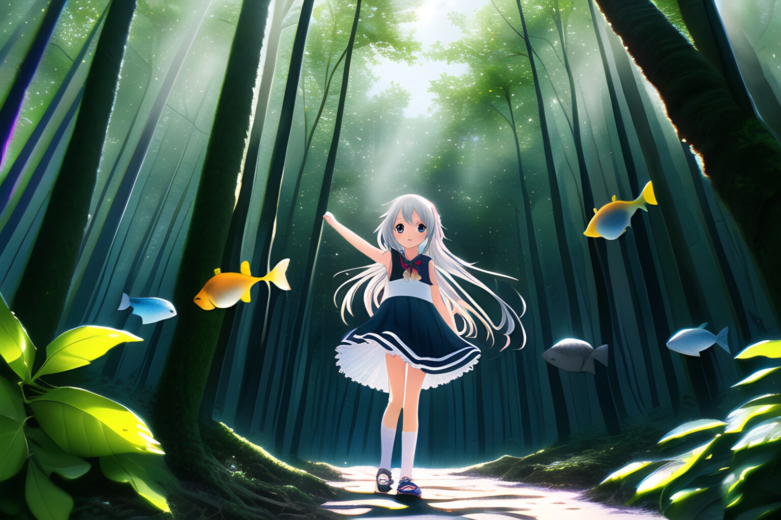 女の子が森の中で宙を泳いでる魚と一緒にいた