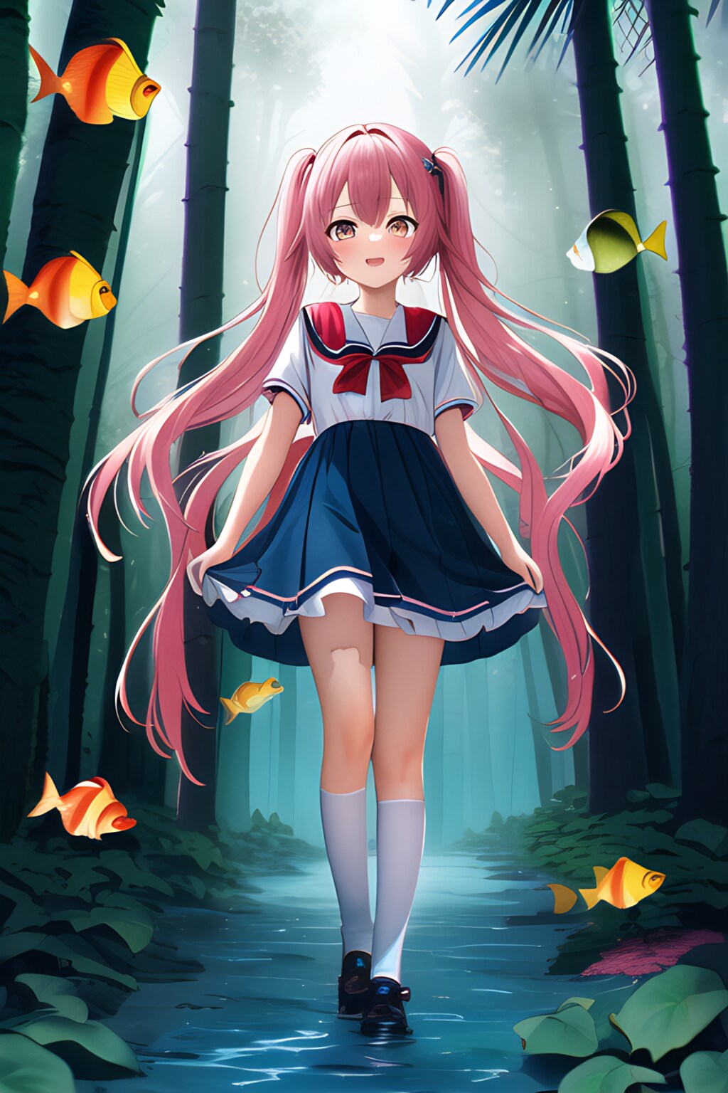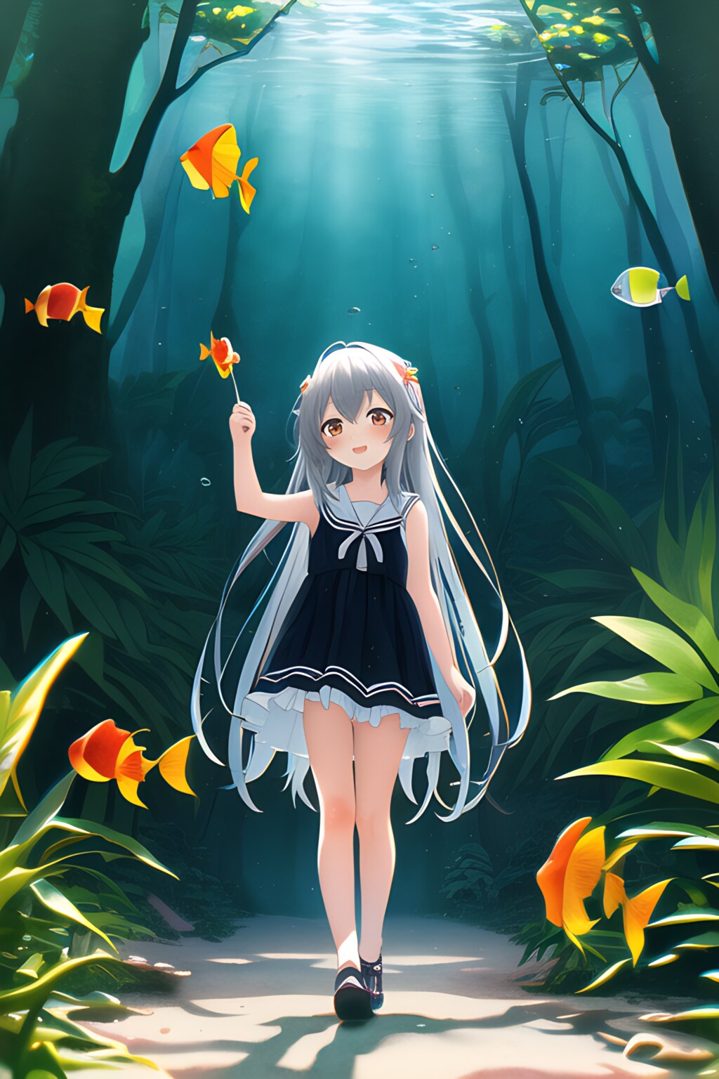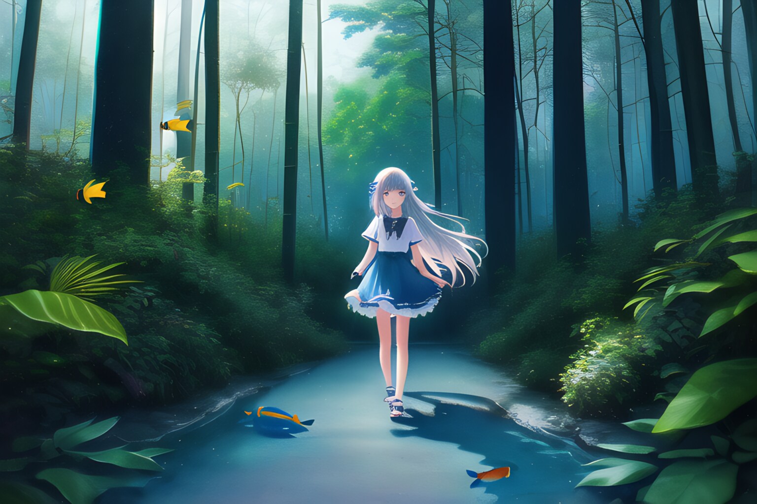 女の子が森の中で宙を泳いでる魚と一緒にいた