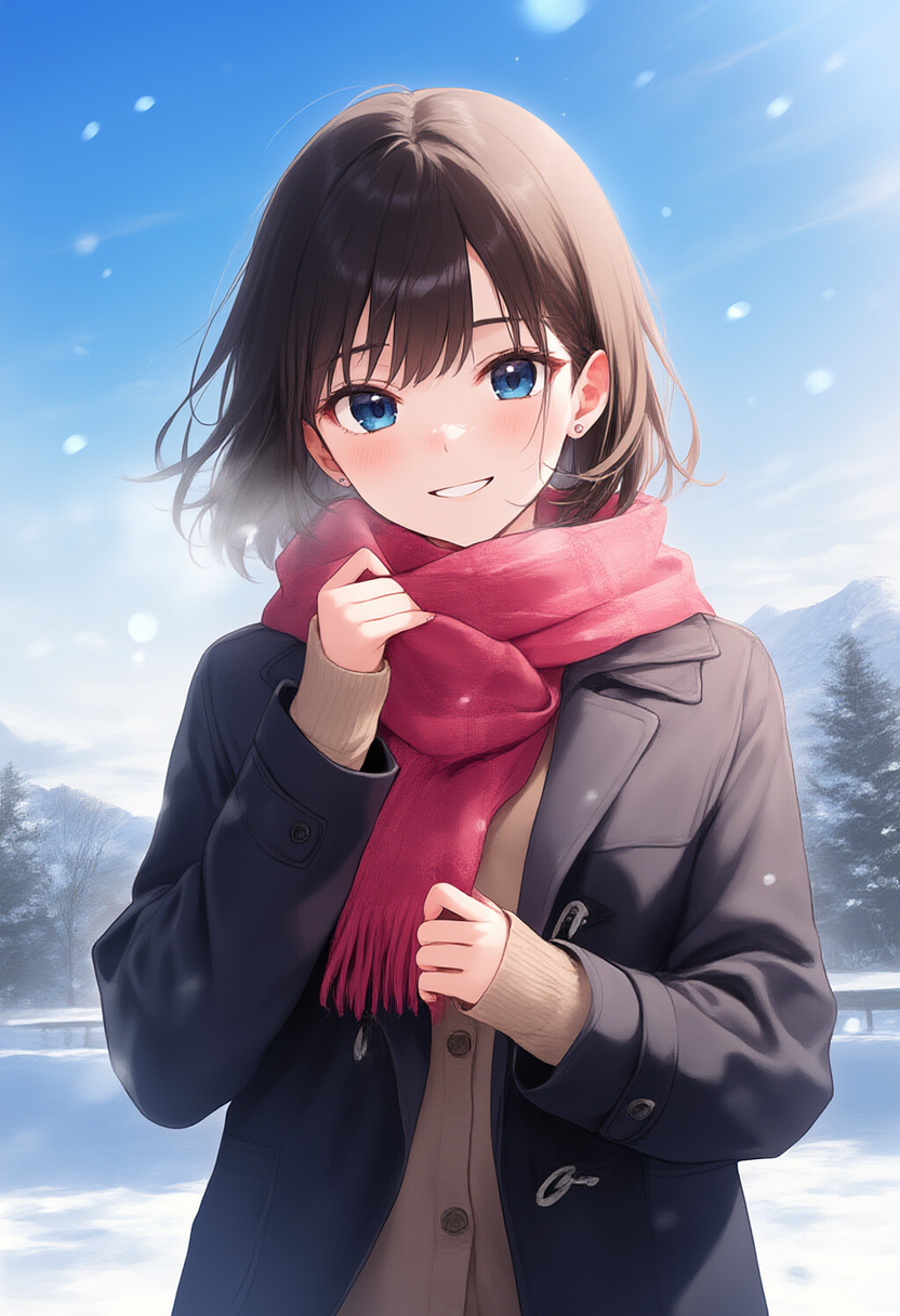 もうすぐ12月と言うことで、赤いマフラーとコート姿です。