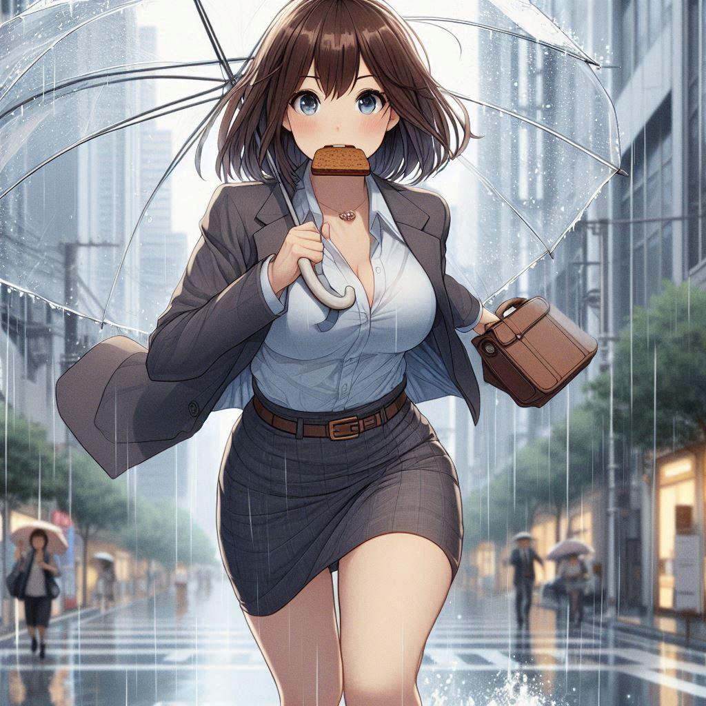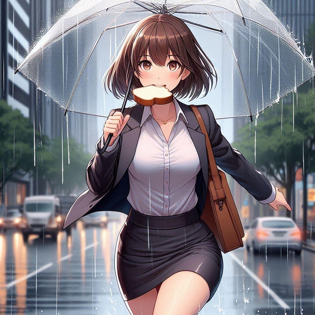 雨の中ビニール傘を差しながらパンを加えて全力疾走!