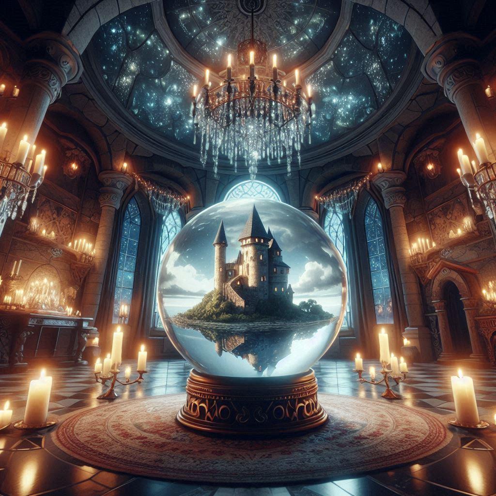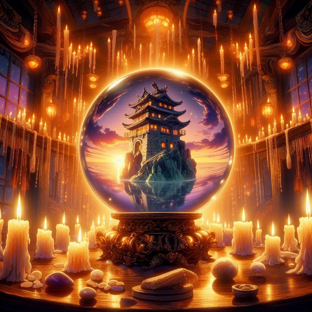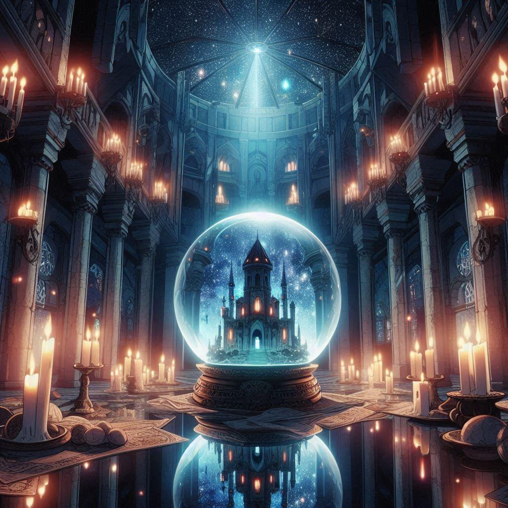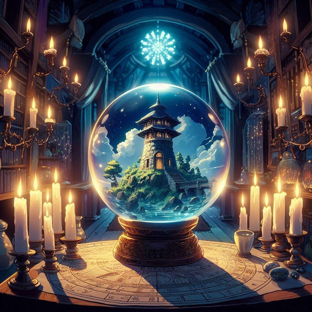 中央の大きな水晶玉にどこかの塔が映り、老人と話すマリカが見える。