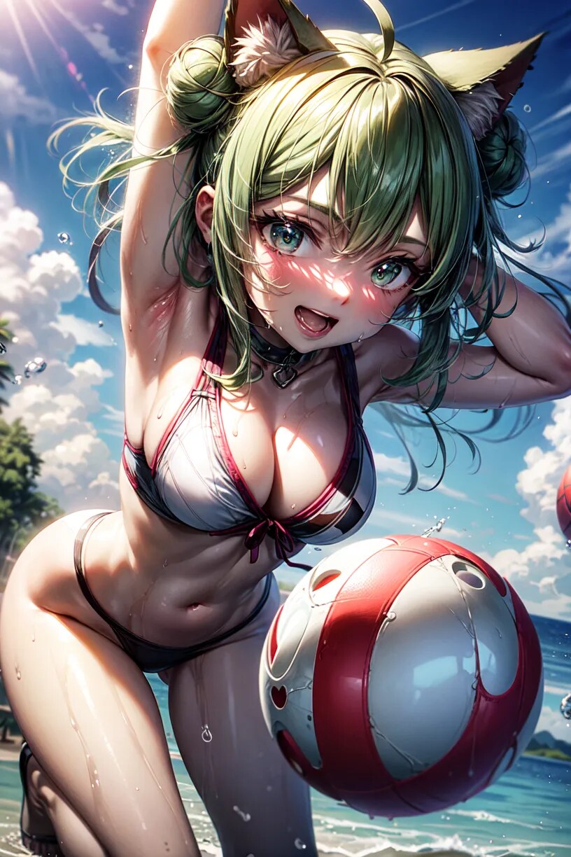 「イェーイ!」ビーチバレーで楽しんでる猫耳ちゃん