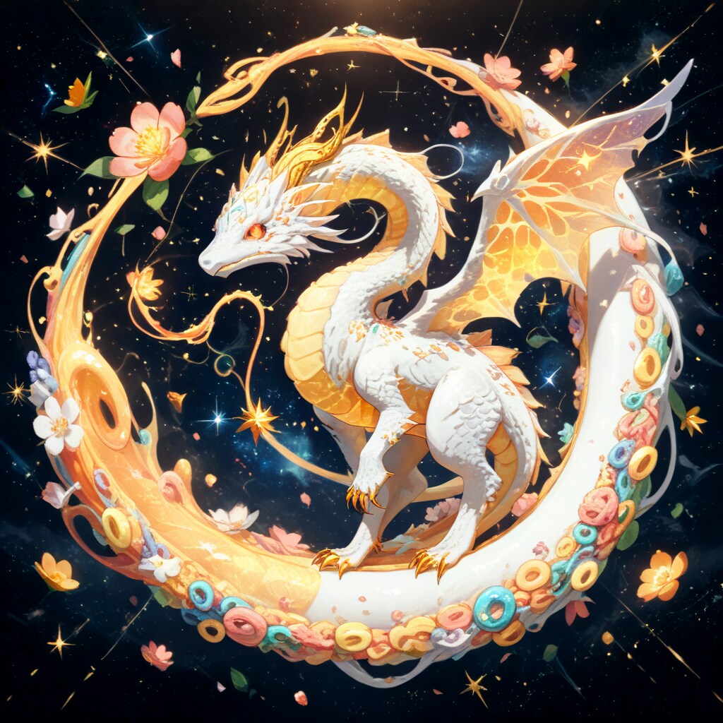 星のように輝く鱗を持つとても小さなドラゴン。とても長い尾を持ち、それを体の周りにリング状にしたり、二つ折りにしたりしてその上で生活している。尾には花が咲き、リング状の模様から次々と花びらを生み出すほか、その花の蜜を好んで食している。夜に翼を広げると夜空の星座のような模様が輝いて見える。人間には友好的だが、警戒心が強いので遠くから見守るだけにしよう。