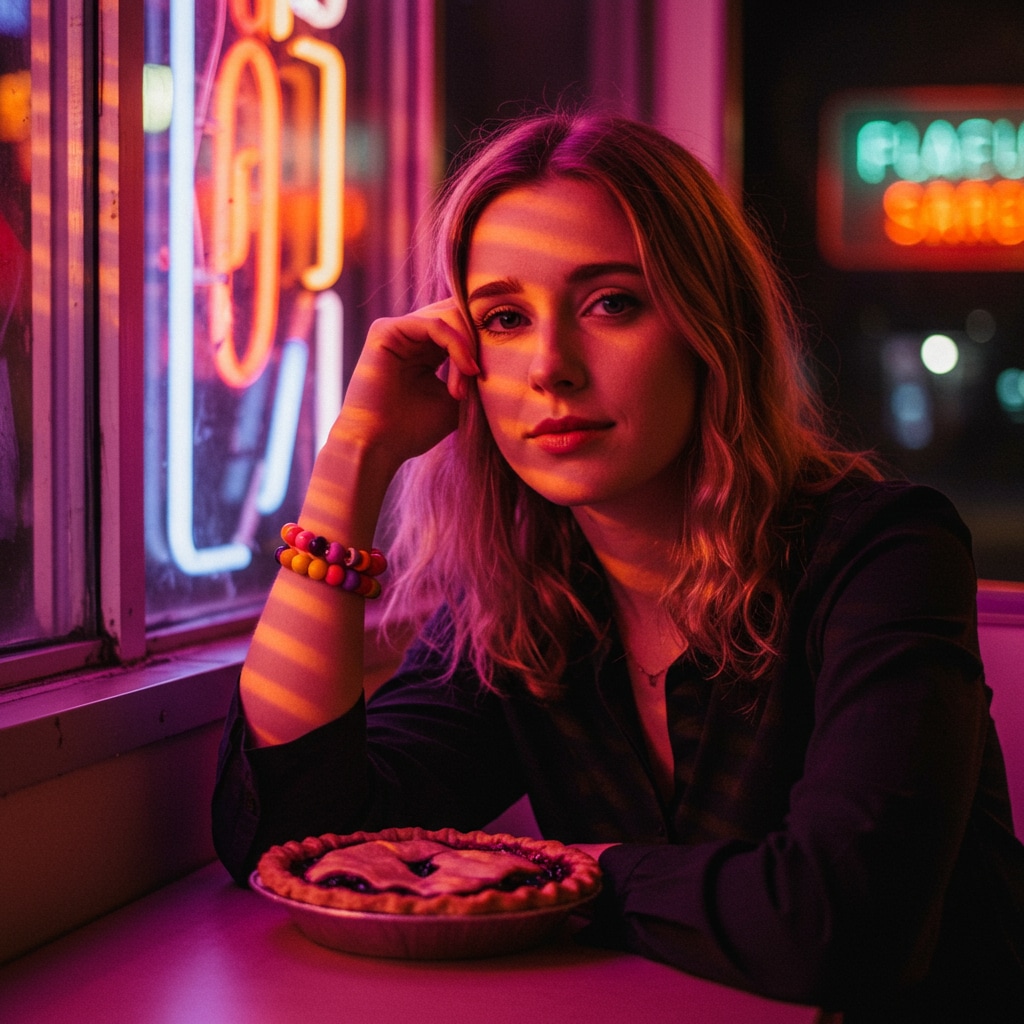 シャーロットは小さく笑いながら、パイを一口食べた。甘くて酸っぱいブルーベリーが口の中に広がる。彼女はその瞬間、このダイナーのネオンの下で、自分が映画の一シーンにいるような気がした。