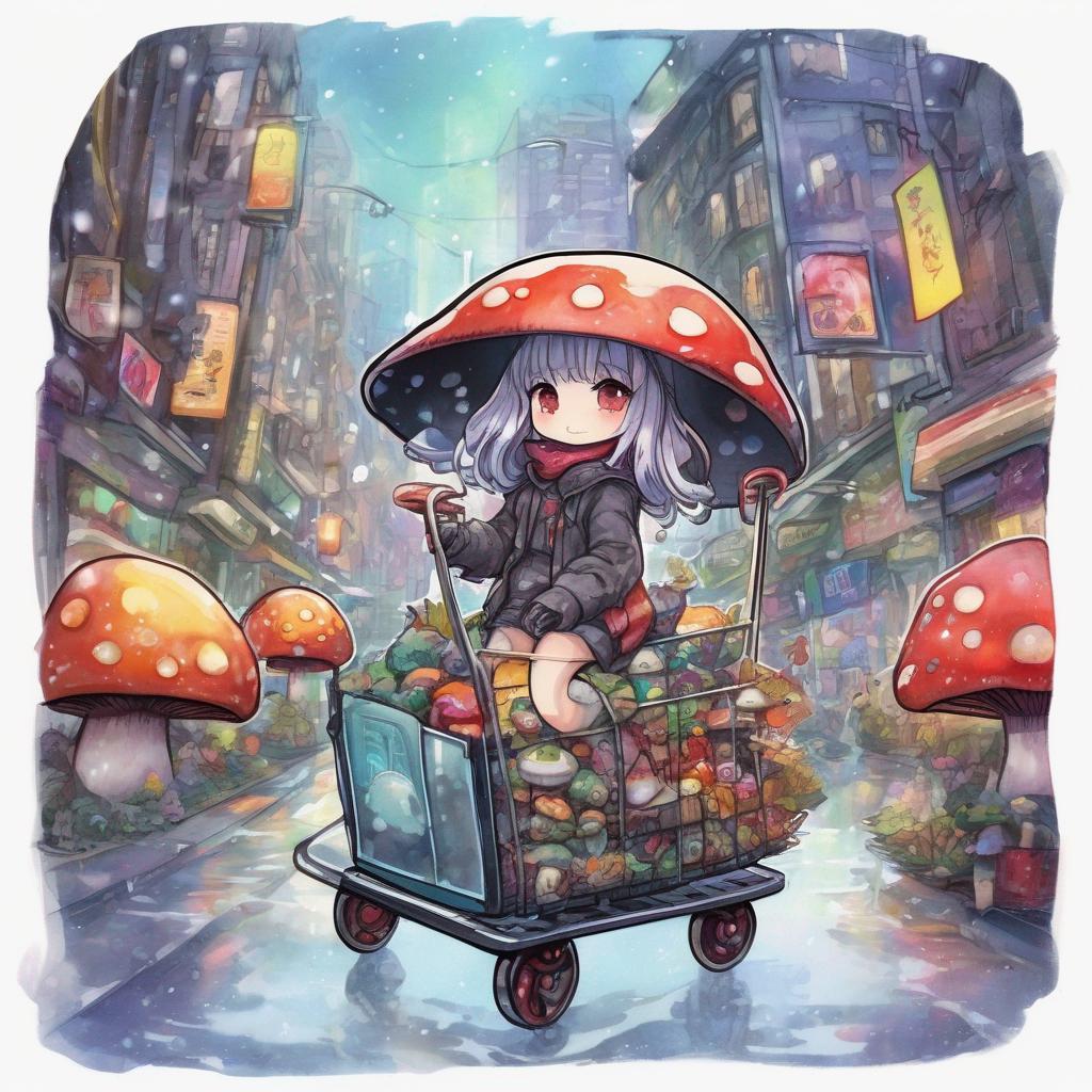 きのこの魔女は、全く意に介さず、きのこが満載のショッピングカートに乗って