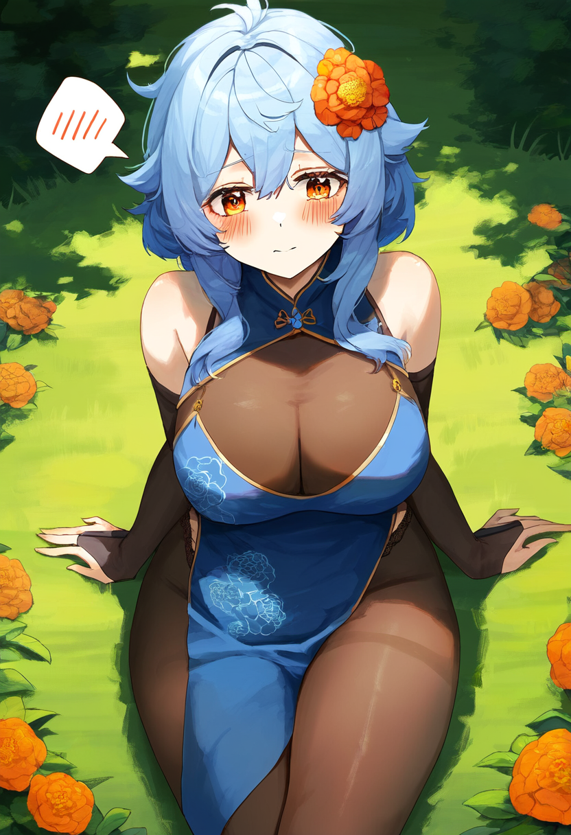 cowboy shot, dramatic angle, angle from above, sit down on the ground, look down, flustered, spoken blush mark, grasses, sunny, 1girl, adult, tall, shiny body, perky breasts, breasts cleavage, hairlessness, thigh gap, light blue hair, medium hair, disheveled hair, orange flower head ornaments, orange eyes, rounded eyes, dark brown long arm gloves, blue long cheongsam clothes with flower patterns, slits, dark brown tights, best quality, pencil drawing, Intricate, filigree, ray tracing, CG, 4K