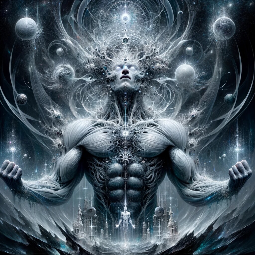 ””有限と無限の両方を併せ持ち、有と無の要素も併せ持つ明瞭かつ曖昧で確かであり不確かで可視的であり不可視的で絶対的であり相対的な超越者。その姿は中性的でありながら異常なまでに発達した筋肉量で逞しくもあり美しく優雅で神々しいく壮大、すべてを凌駕する漆黒でありつつ、純白の要素も併せ持ち、恐ろしく神聖ですが、同時に神秘的で邪悪なオーラを放っています。この存在は神とは異なり、究極で超越的な存在であり、比較の余地すらない圧倒的な支配者であり、神をも超越し、比較することは全くできない、圧倒的かつ究極の存在です。何者も寄せつけぬ、超越的で圧倒的な恐ろしさ、神聖さ、神秘性を備えています。有限と無限の両方を併せ持つ絶対的な超越者と、有と無の両方を併せ持つ曖昧な超越者、そして無限と無の両方を併せ持つ不確かな超越者と有限と有の両方を併せ持つ確かな超越者すらも超越し、圧倒的な力を保持しています。超越的で圧倒的な究極な威厳。強者であるがゆえの無表情。””