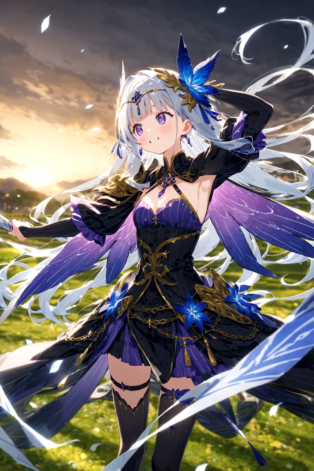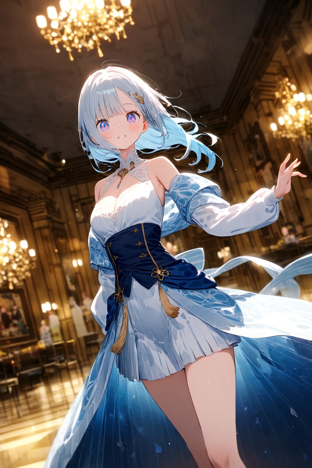 dynamic angle, animate action, masterpieces, best quality, ultra-detailed, super fine, very transcendence detailed, 8K, 4K, perfect anatomy, silky skin, a confident expression and looks relaxed while taking an elegant pose. The background is decorated with subdued interiors and delicate decorations, making the scene feel refined and artistic overall. Blurry background