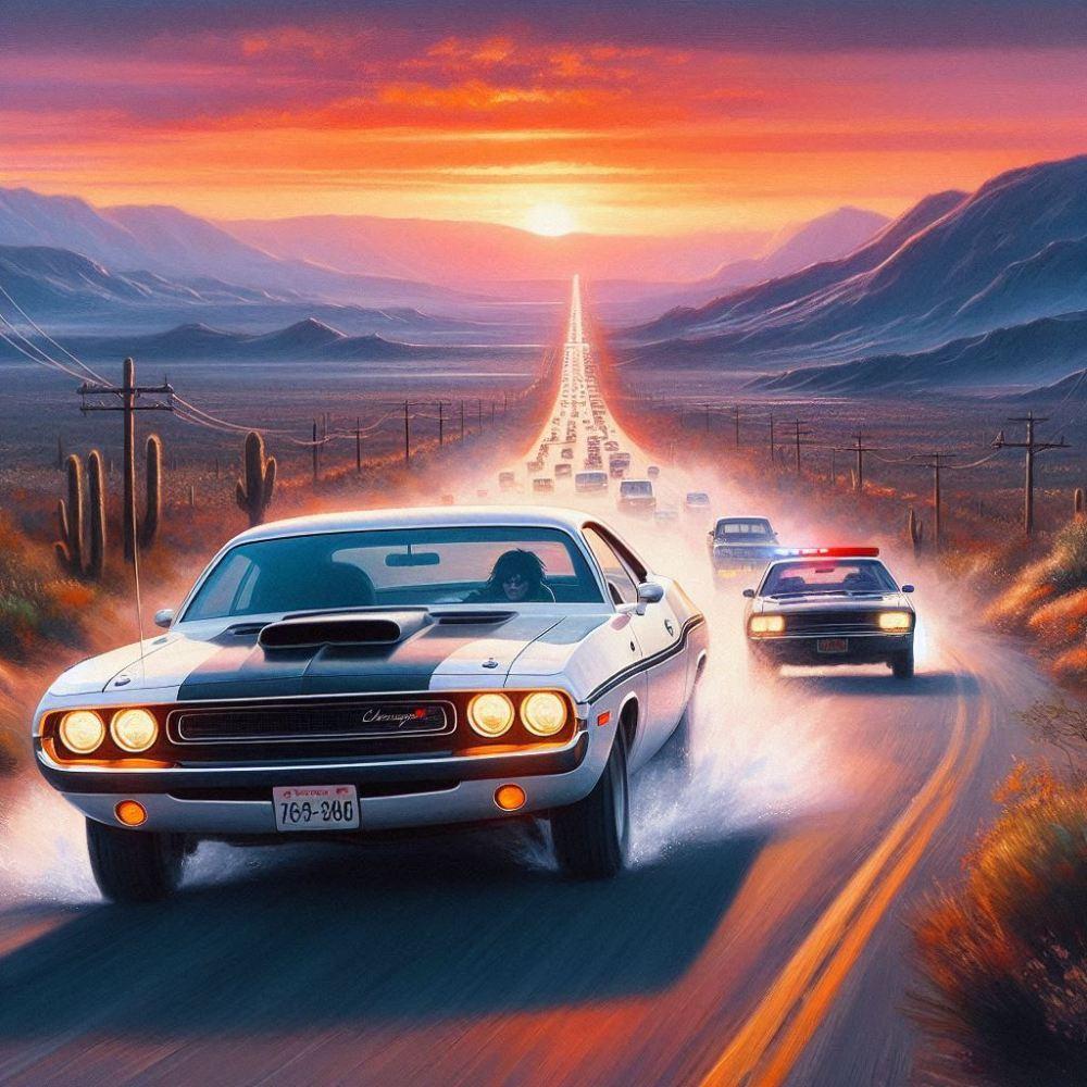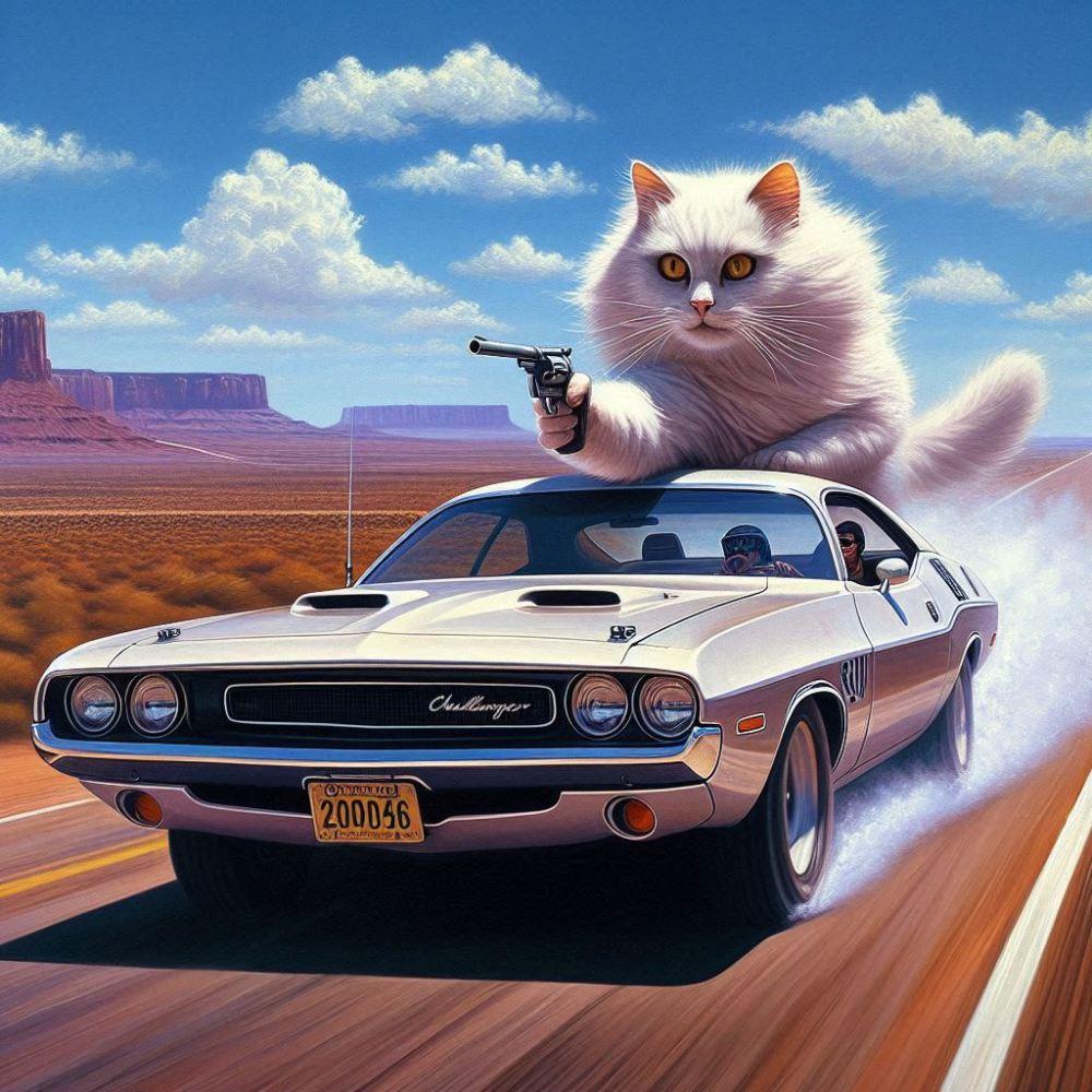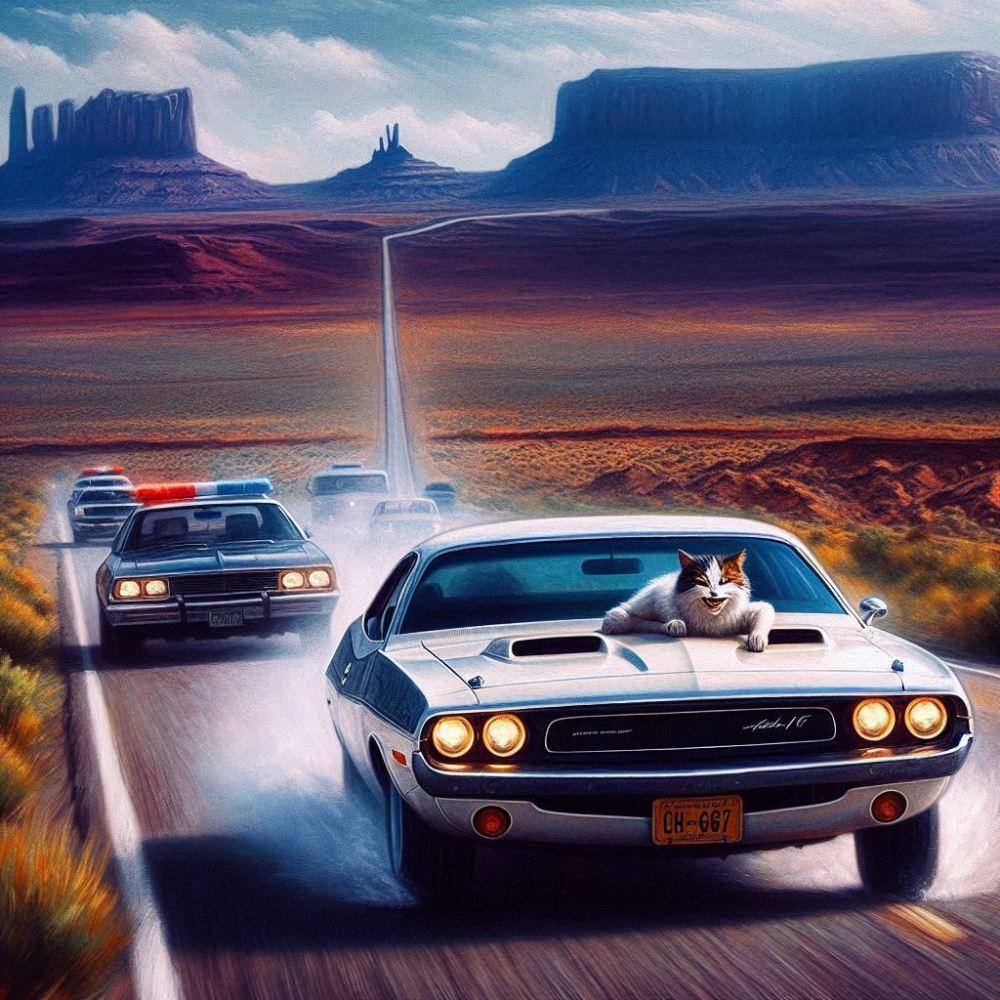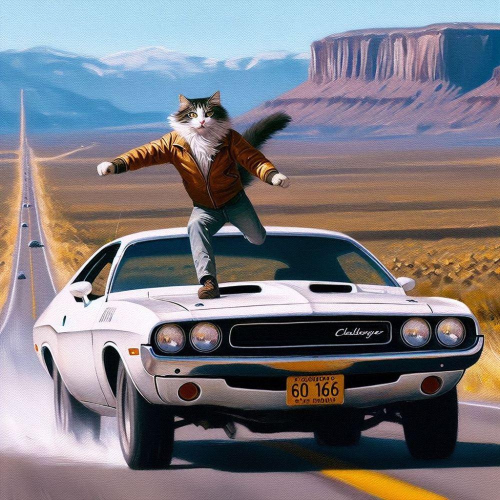 1970年代&カーアクション映画&油絵風、マッスルカーのスタント撮影の仕事をするサングラス猫