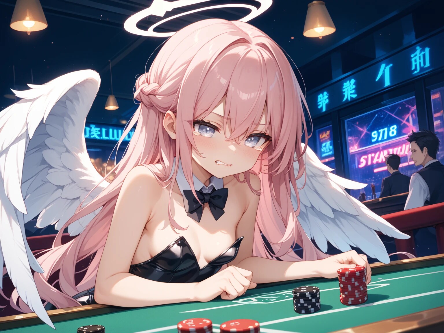 カジノで負が込み、負債の一部を軽減するためバニースーツを着込んだが、さらに負を重ねる天使の図。
