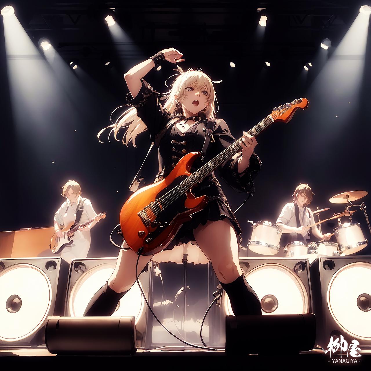 指や弦など細かいところは手描きで修正しているけど、バックバンドの楽器とか、メインボーカルの娘の足元のモニタースピーカーはPhotoshopのジェネレーティブ塗りつぶしで生成