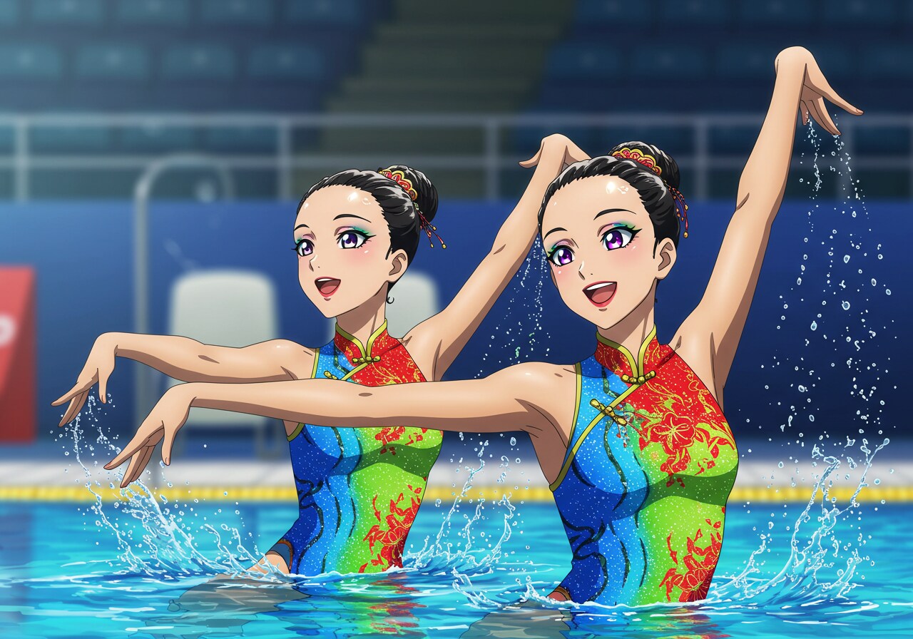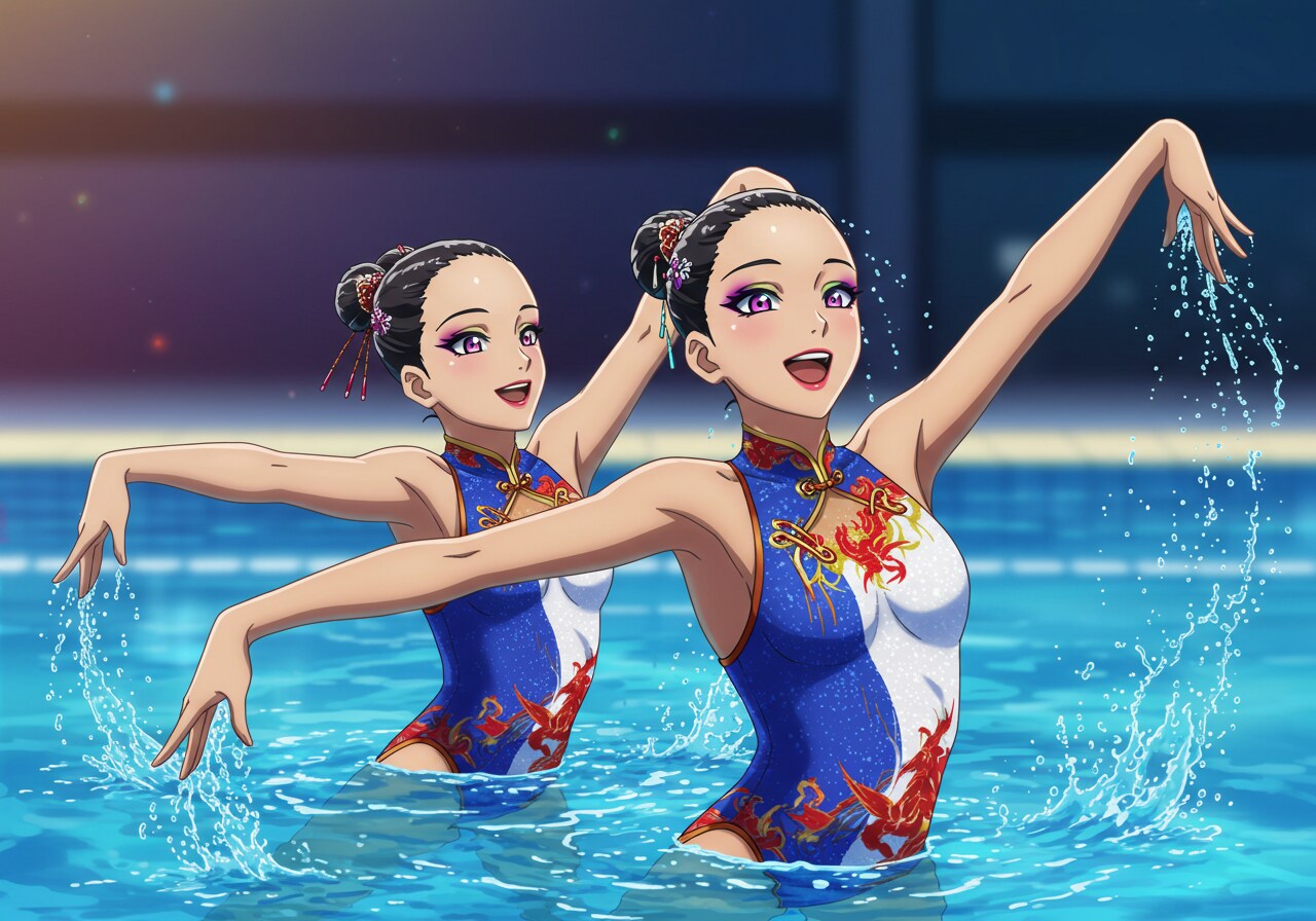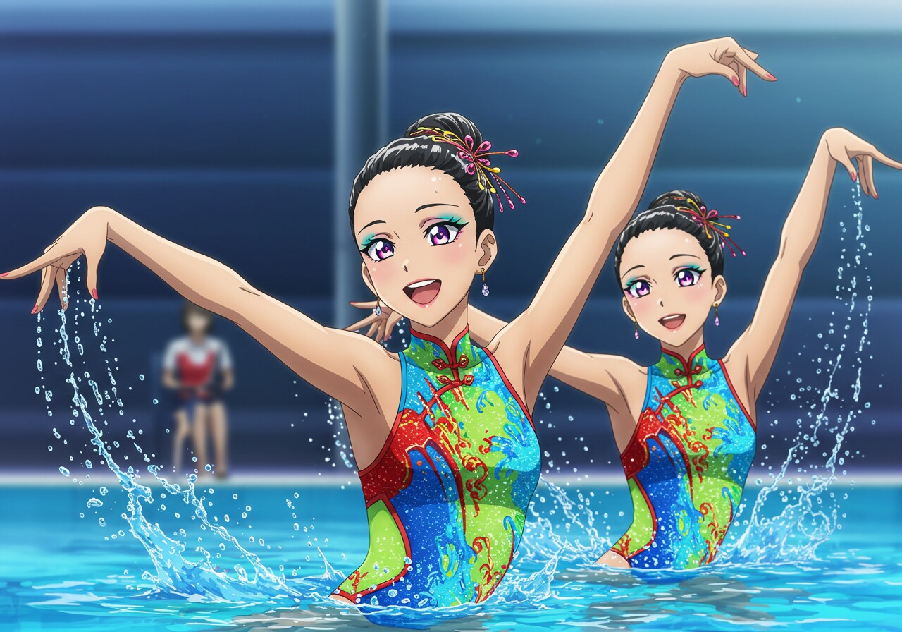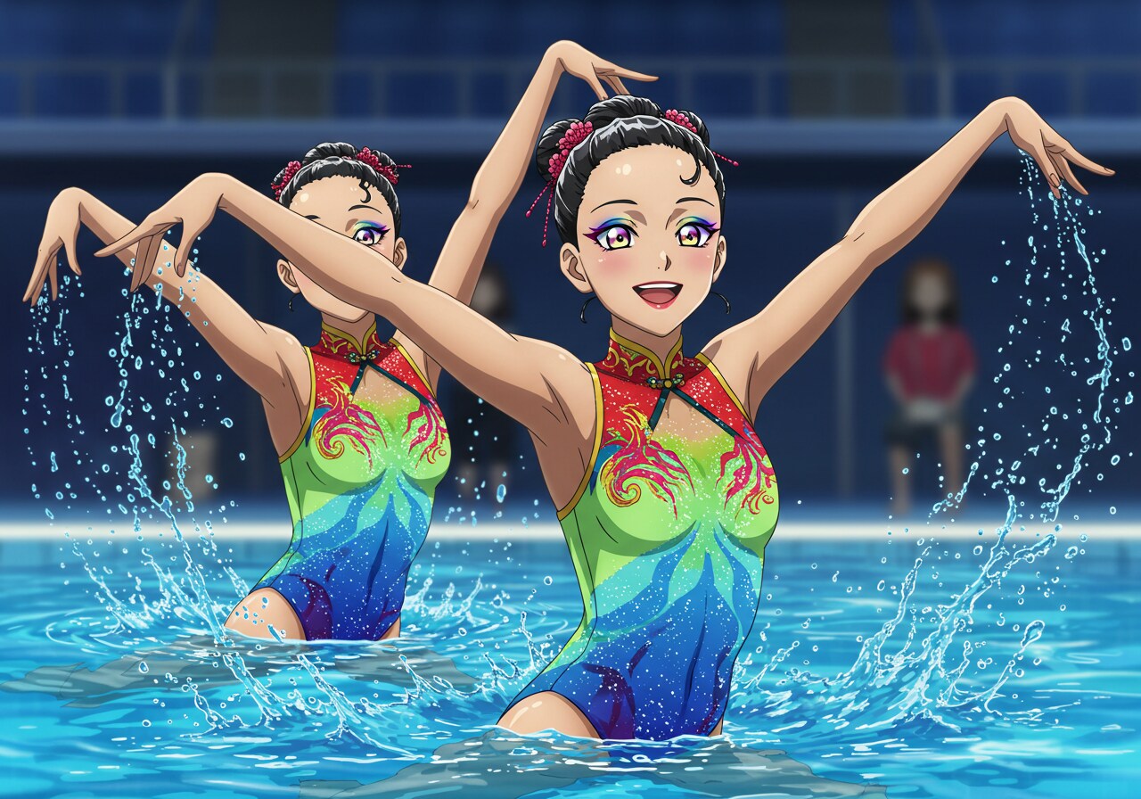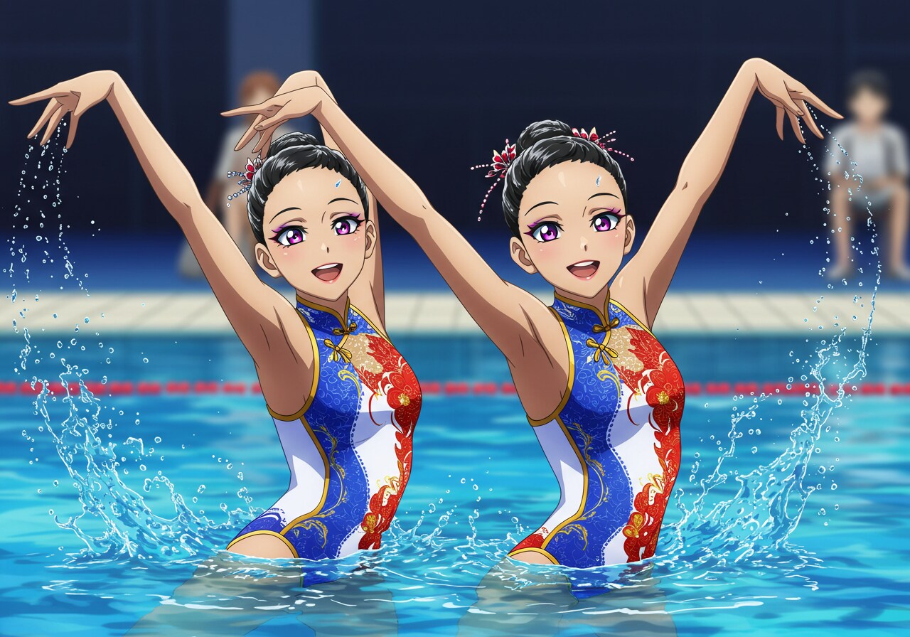 水着はチャイナドレス風にしています。 驚くほど可憐で、かわいい美少女シンクロナイズドスイマーをアニメ風イラストに描写するのは難しいです。