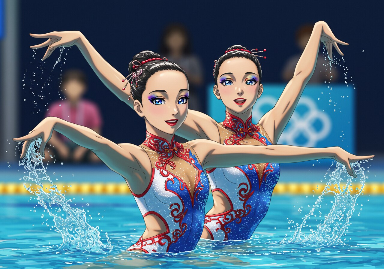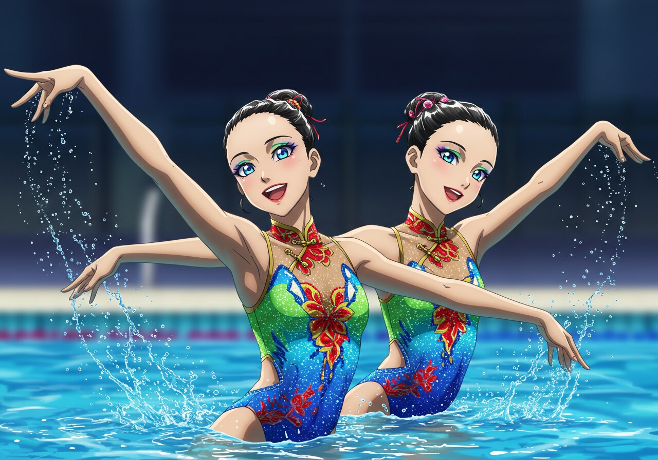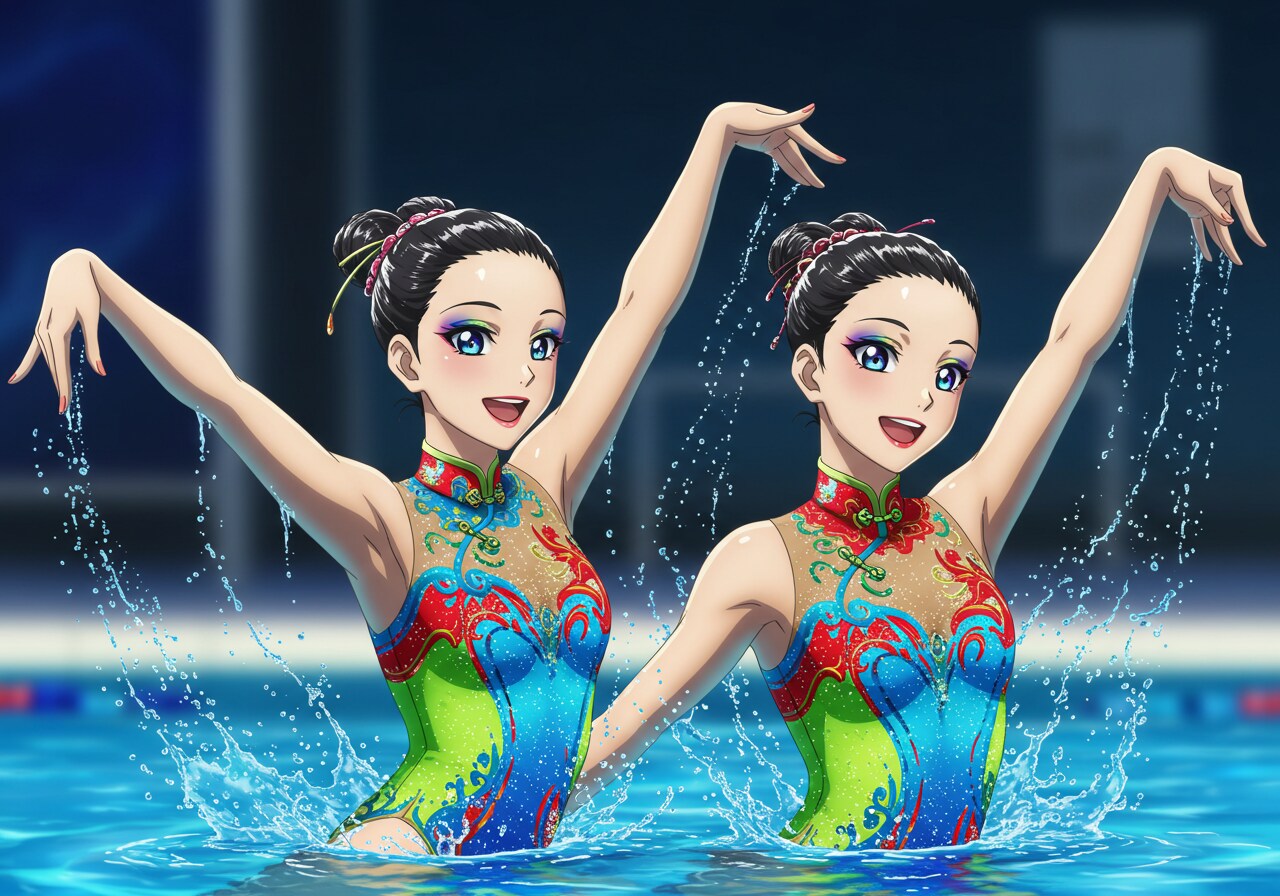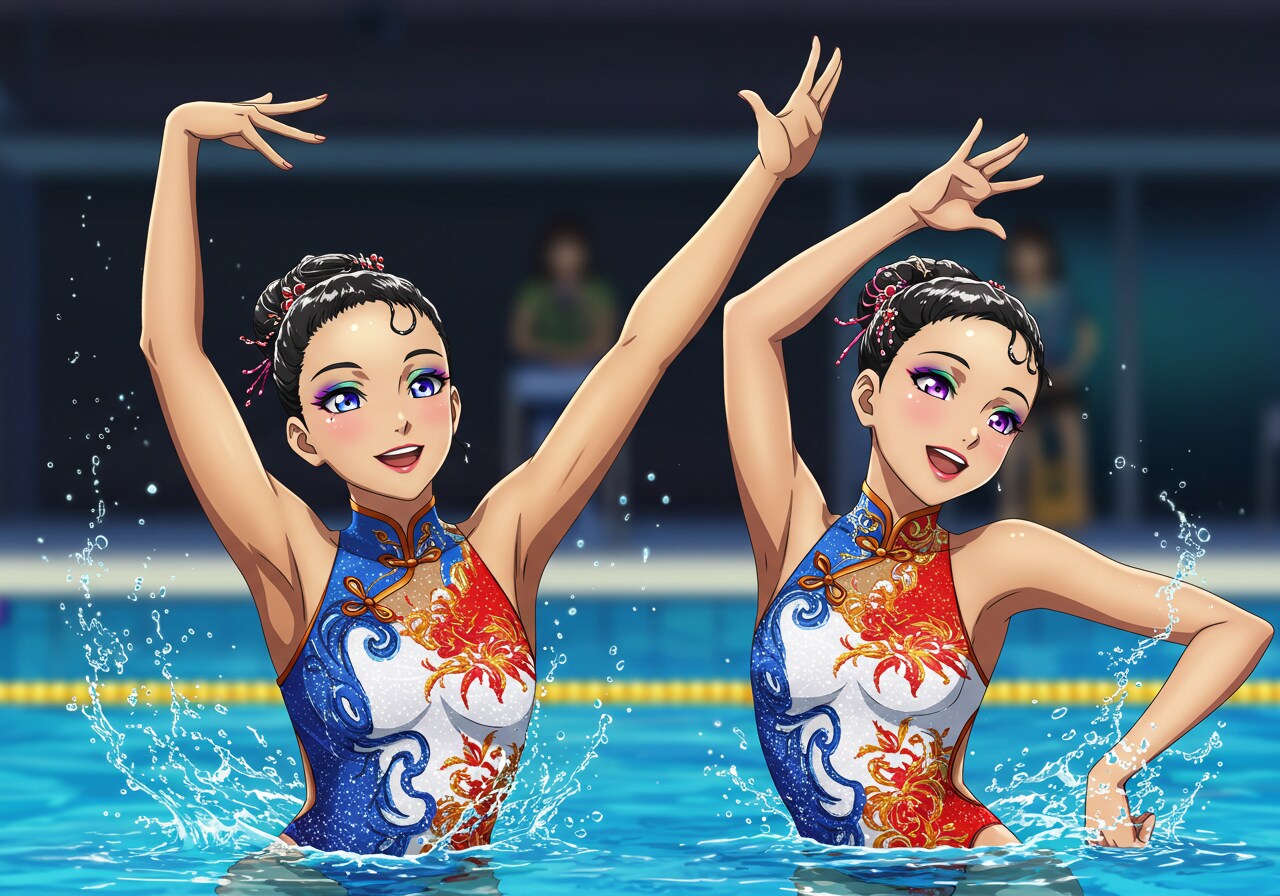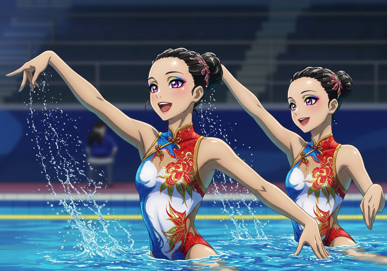 水着はチャイナドレス風にしています。 驚くほど可憐で、かわいい美少女シンクロナイズドスイマーをアニメ風イラストに描写するのは難しいです。