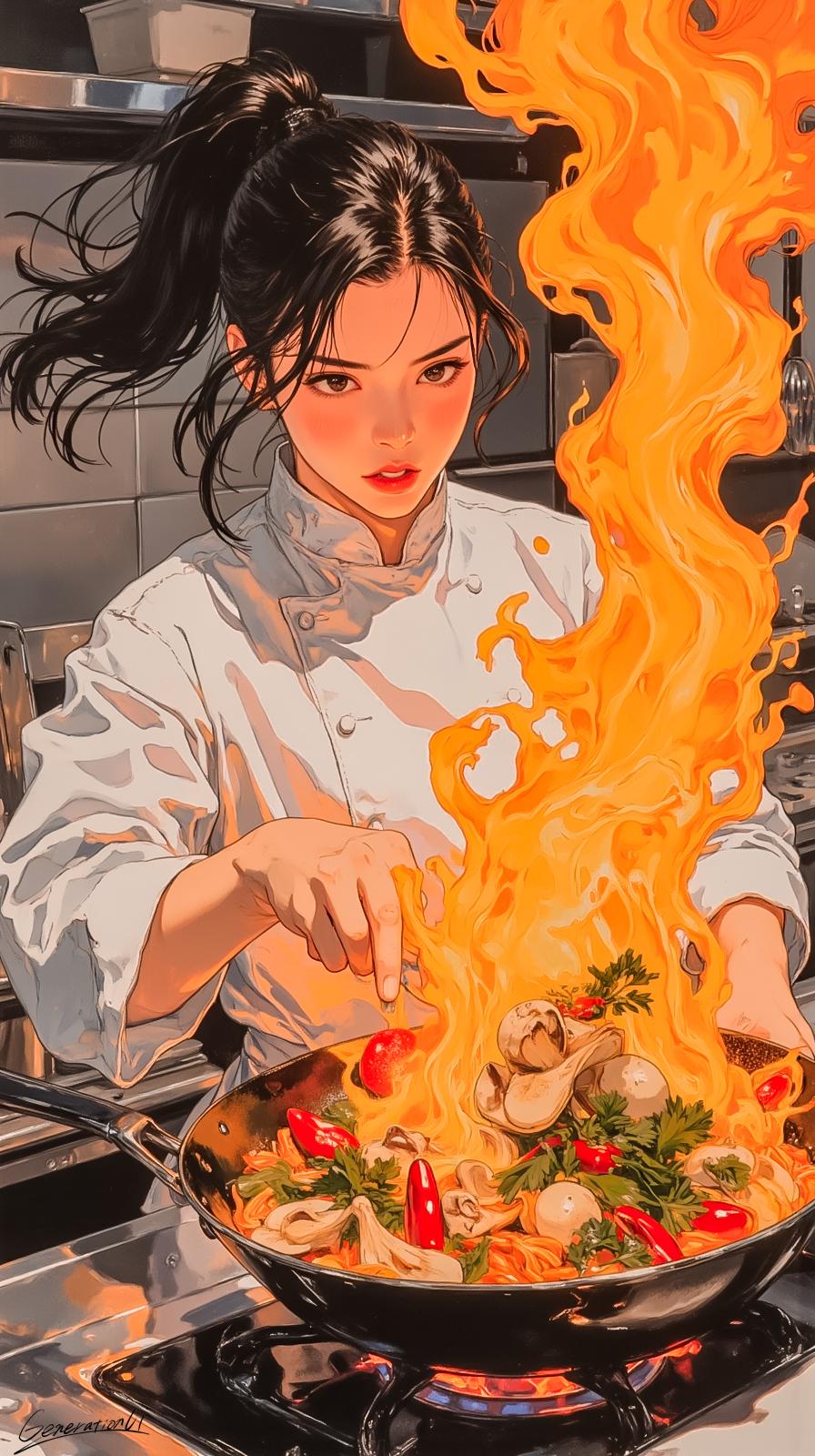 鍋肌で跳ねた油が火に包まれ、スモーキーな香りが一瞬で広がる。