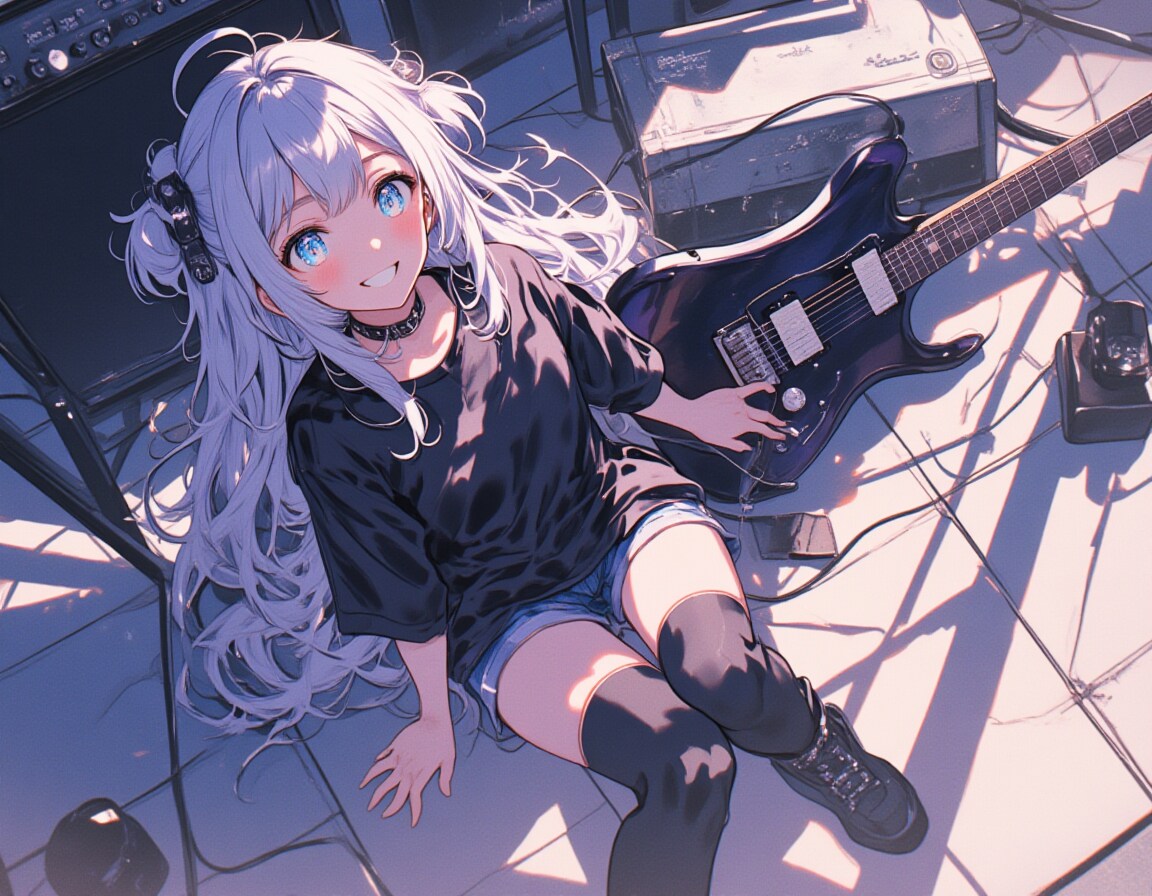An anime-style image of an 8-year-old girl with long,fluffy hair and large,bright blue eyes,sitting on a tiled floor with an electric guitar in her lap,connected to a nearby amplifier with a cable. She has a cheerful,innocent smile with a hint of curiosity,looking directly at the viewer. Her hair is styled with bangs and sidelocks,with a small ponytail at the back. She wears a black choker,a simple black shirt,blue shorts,and black thigh-high socks with boots. Her youthful look is enhanced by small earrings,giving her a playful yet slightly edgy appearance as she enjoys her solo moment in a realistic,music-inspired setting.,