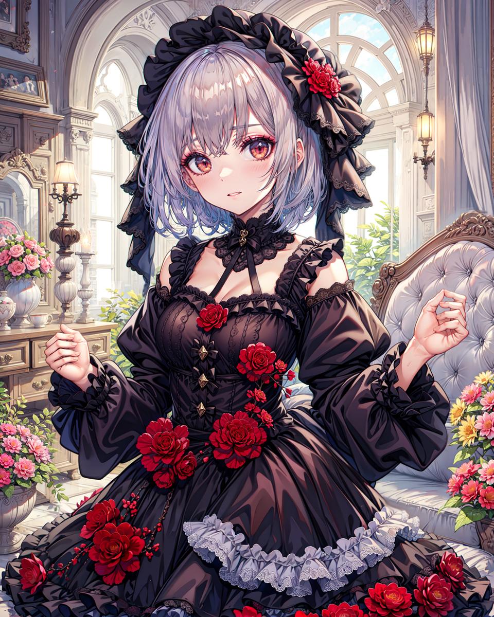 ある日、美しい一人の少女がいました。彼女の名前はまだ分からないけど、彼女はショートヘアの灰色の髪と赤い瞳を持っていました👀 彼女はゴシックロリータの黒いドレスを着ていました。そのドレスはフリルで飾られ、袖はふわふわと膨らんでいて、肩から離れていました👗