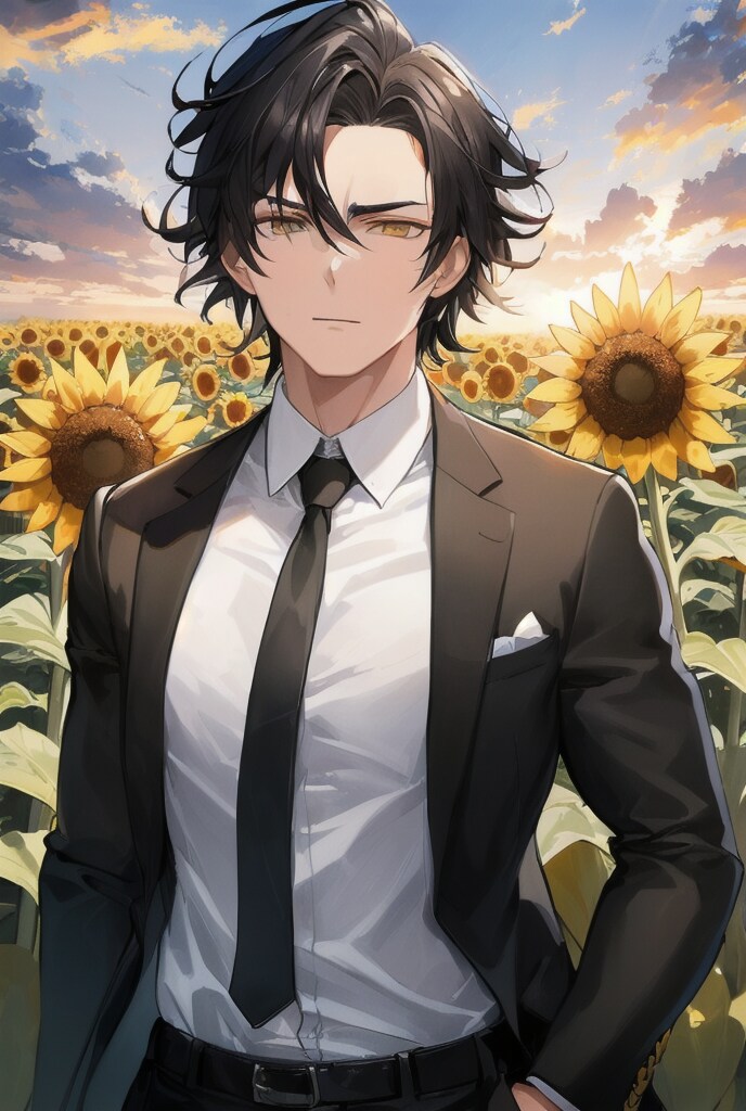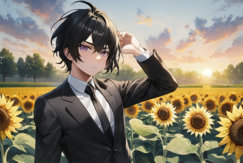夕焼けの向日葵畑と佇む黒髪短髪男性(12枚)
