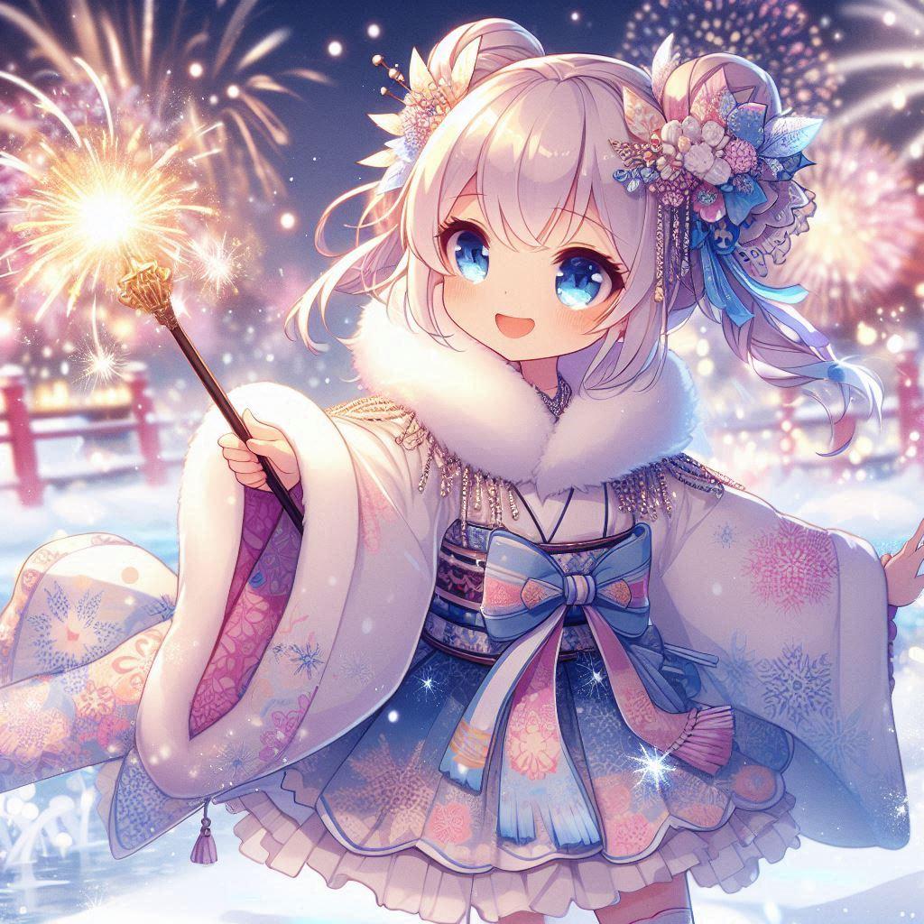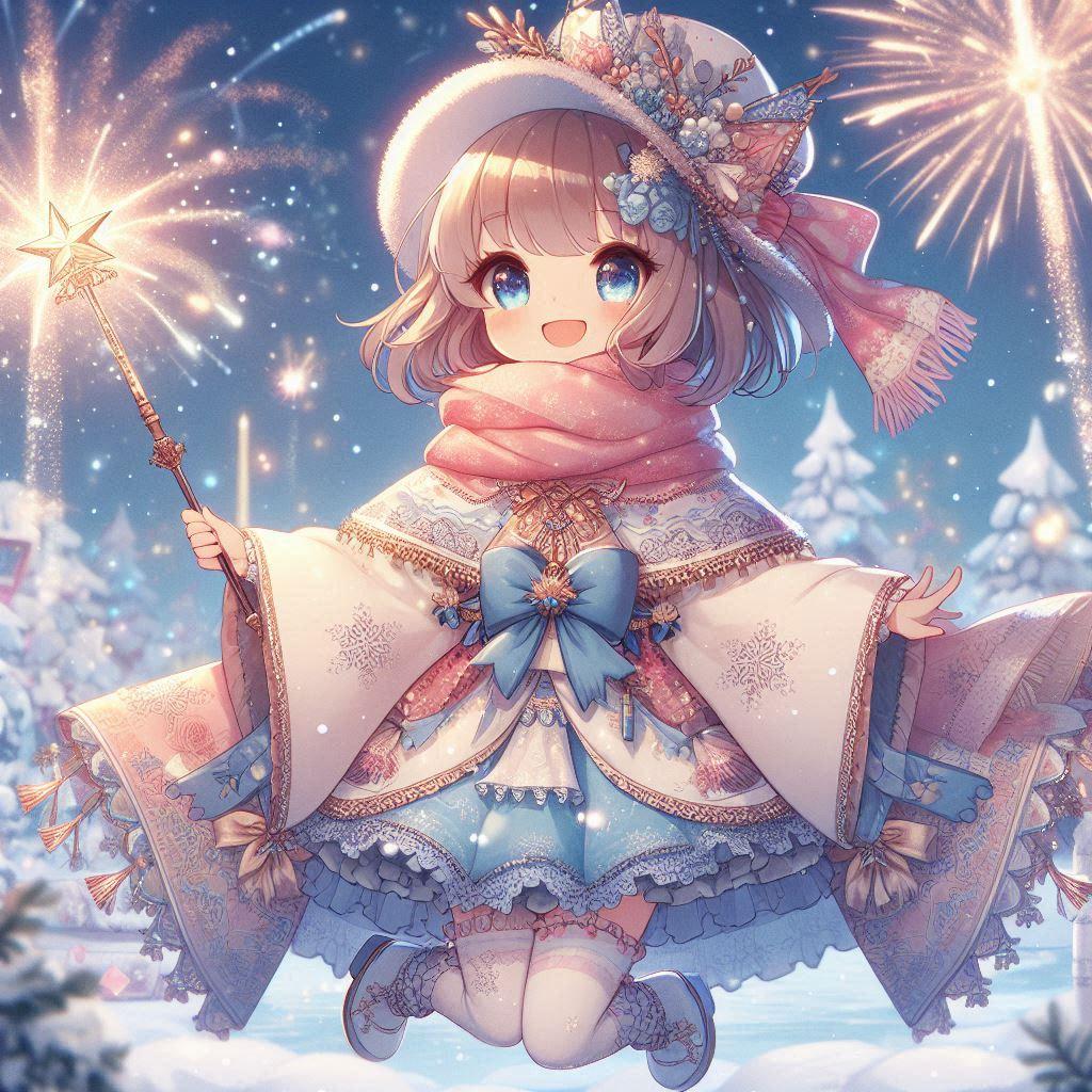 意図:冬の花火が夜空を彩る中、雪景色を背景にした魔法少女の幼女が描かれています。和風の冬着風の衣装に、細かいリボンやフリルが施され、輝く魔法の杖を持ちながら笑顔を見せています。雪の結晶や柔らかな冬の光が幻想的な雰囲気を引き立てています。