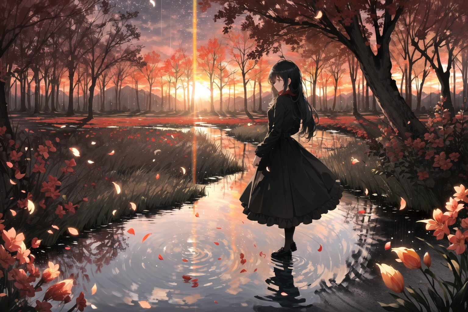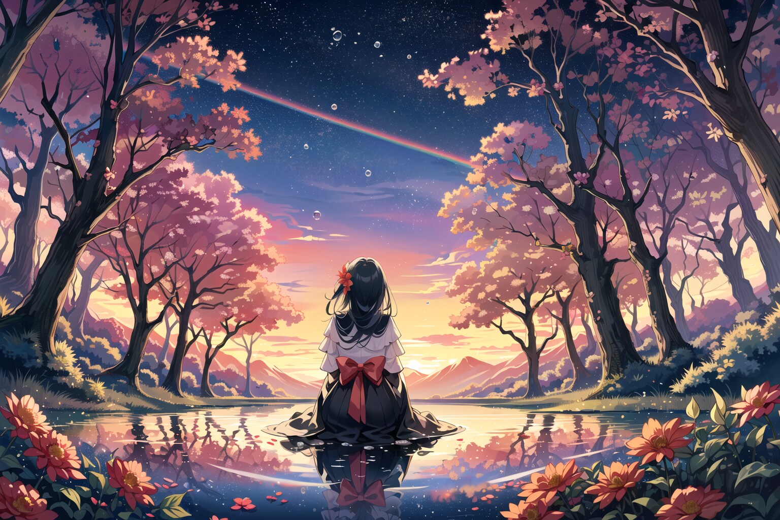 (rainbow,🌈:1.2), (petal:1.6), (star trails:1.2) , (red Flowers soaked in dropletsand illuminated by the light:1.6), (Raindrops on flowers)