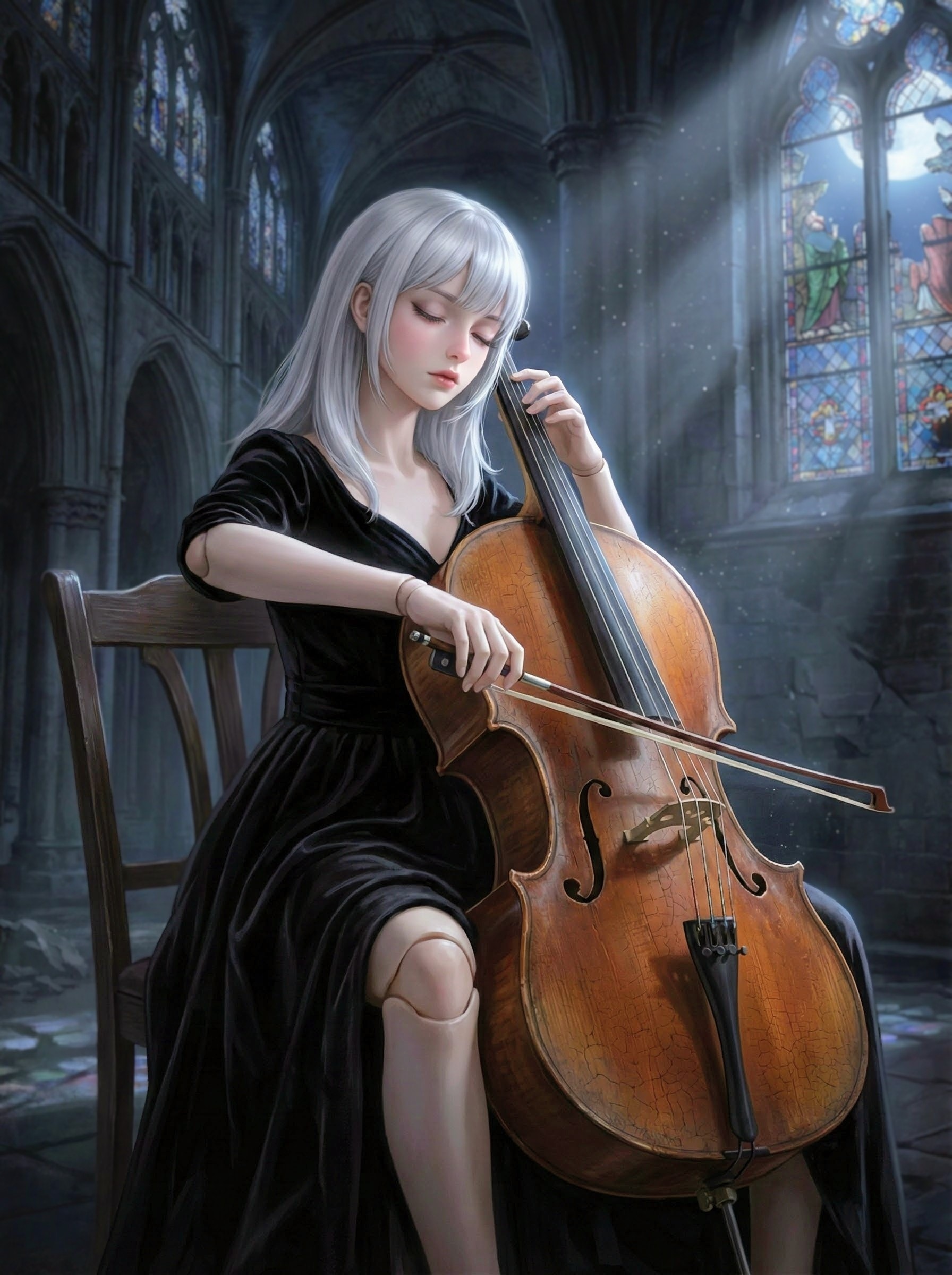 ・Material: アンティーク・チェロのニスに見られる「Craquelure (ひび割れ)」と、舞い散る「Rosin dust (松脂の粉)」を描写し、使い込まれた楽器の質感を表現しました。