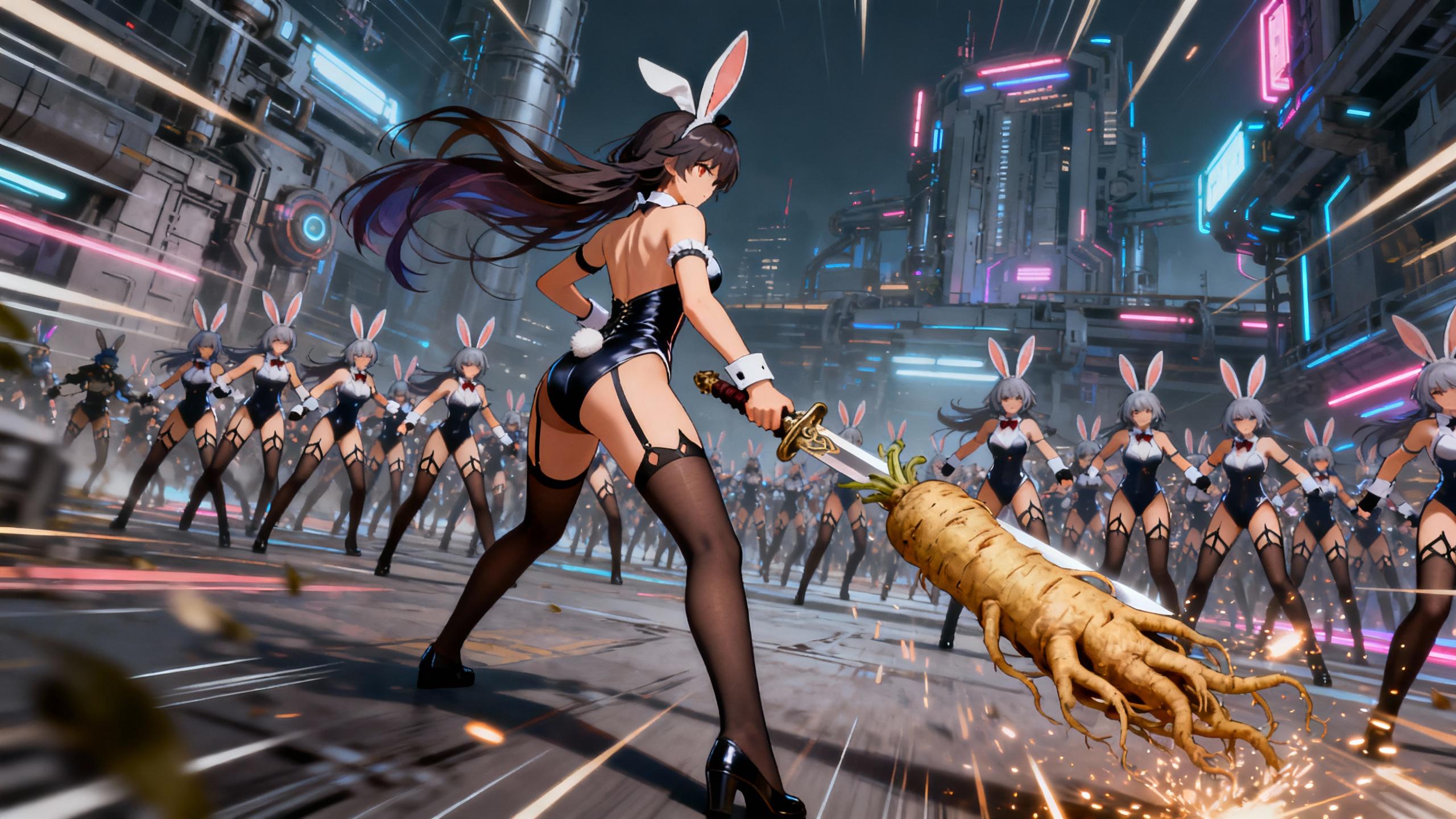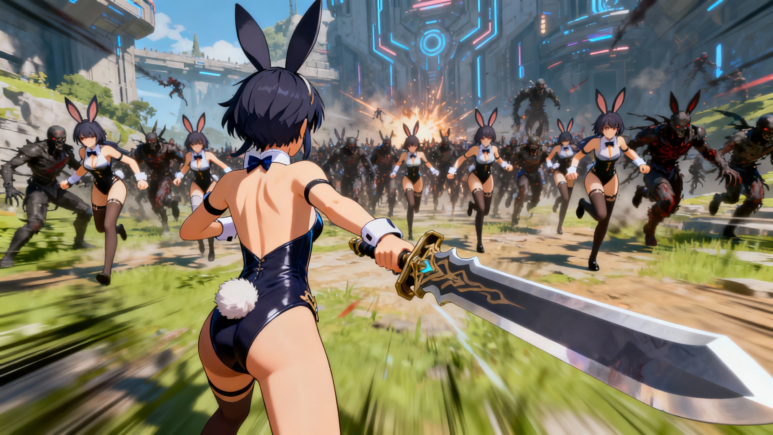 架空無双系ゲーム!「バニー無双!」のゲーム画面っぽいイラストww(2枚目は、謎の高麗人参?付きブレード💦)