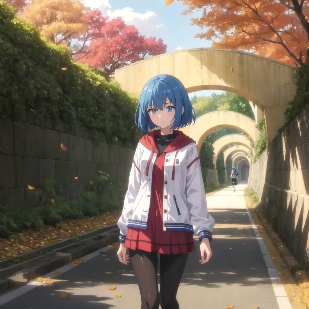 チュニックとレギンス:快適さを重視したチュニックとレギンスの組み合わせは、長時間の散策にもぴったり。青髪ボブ子ちゃんは、紅葉のトンネルを抜けるとき、その美しさに思わず立ち止まり、静かにその景色を楽しんでいます。