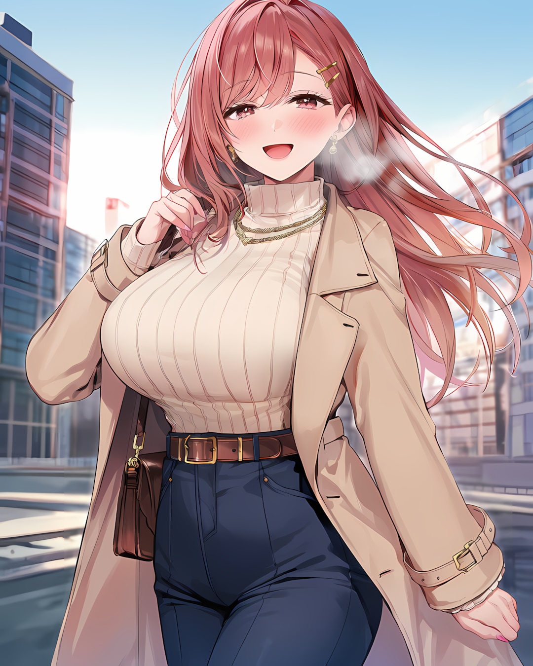 キャメルのロングコート×クリームタートルで、朝の冷たい空気も怖くない!