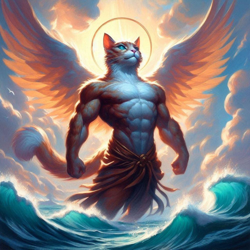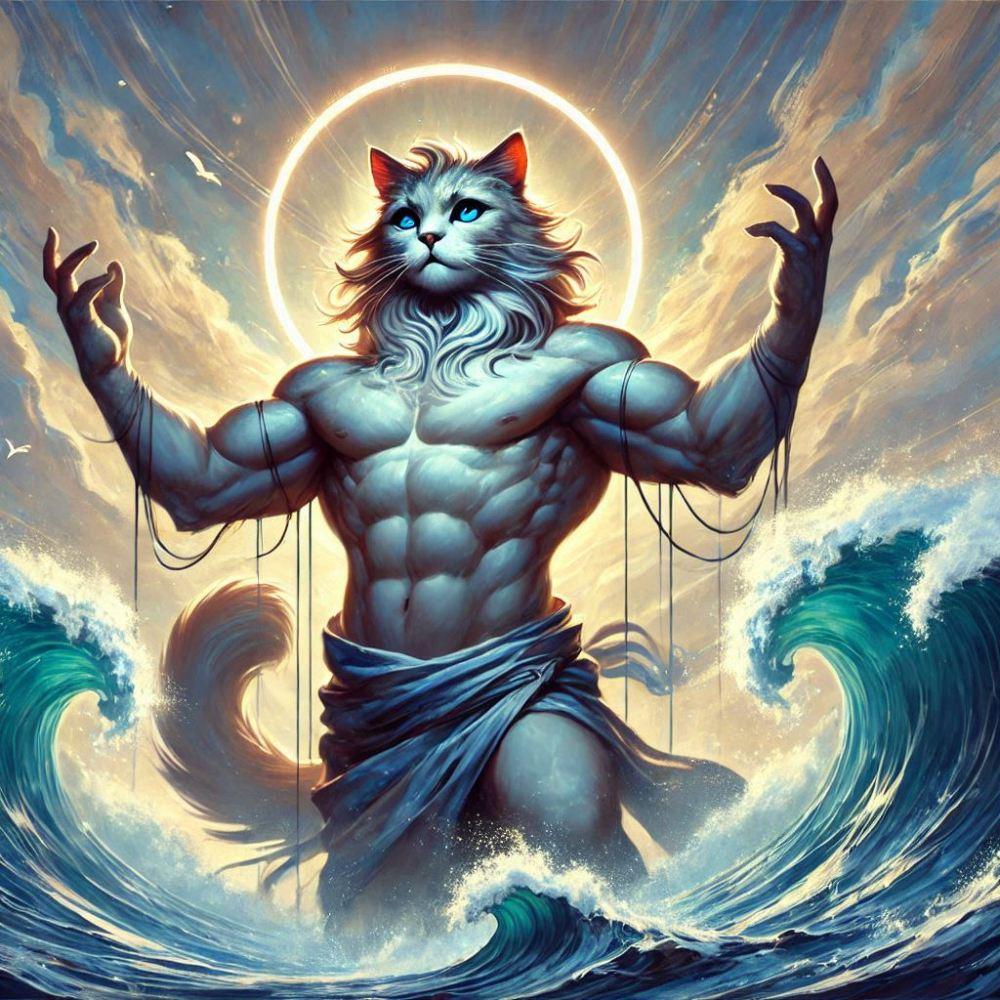 アクリルファンタジー、ふんどし姿で仁王立ちの筋肉猫、海