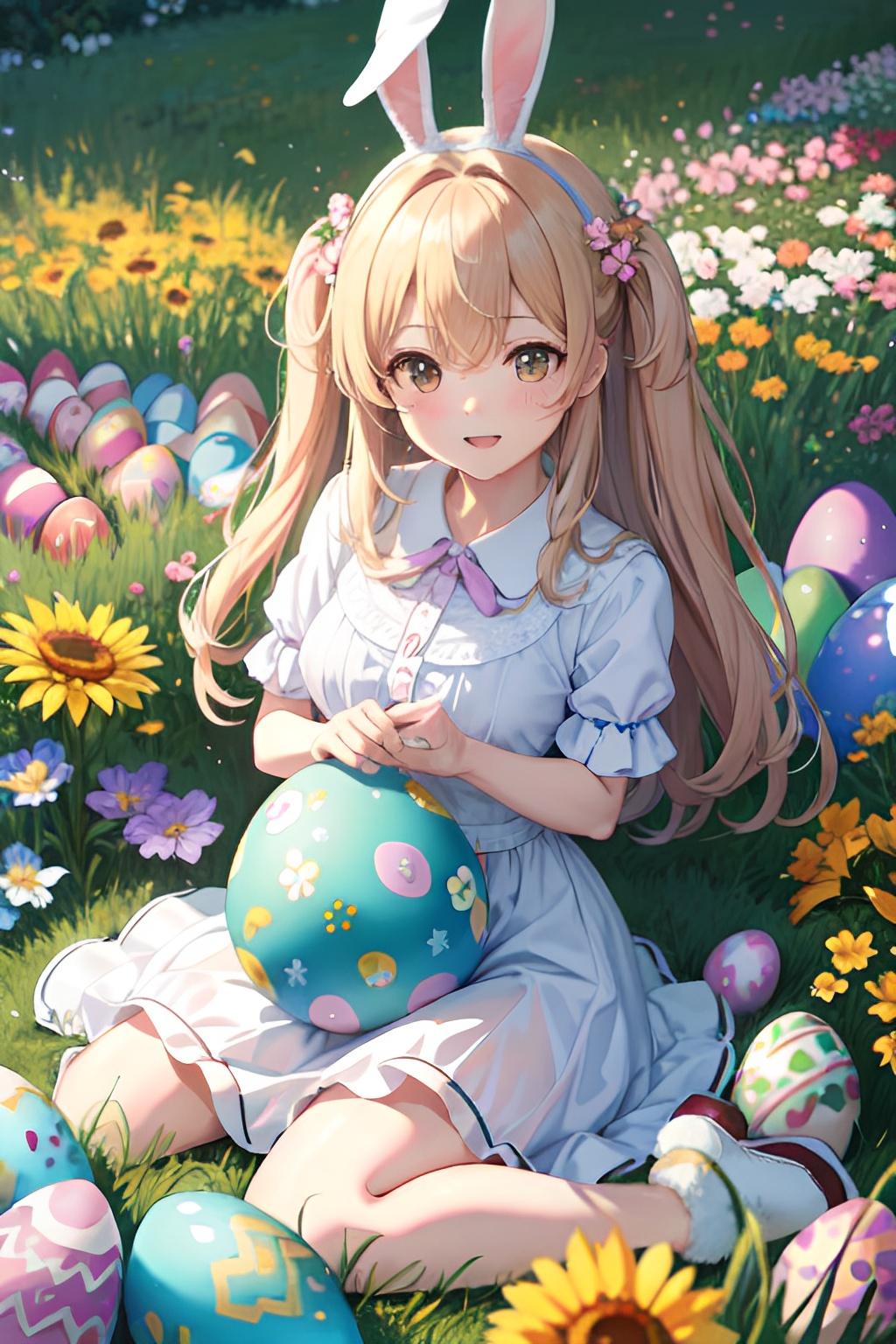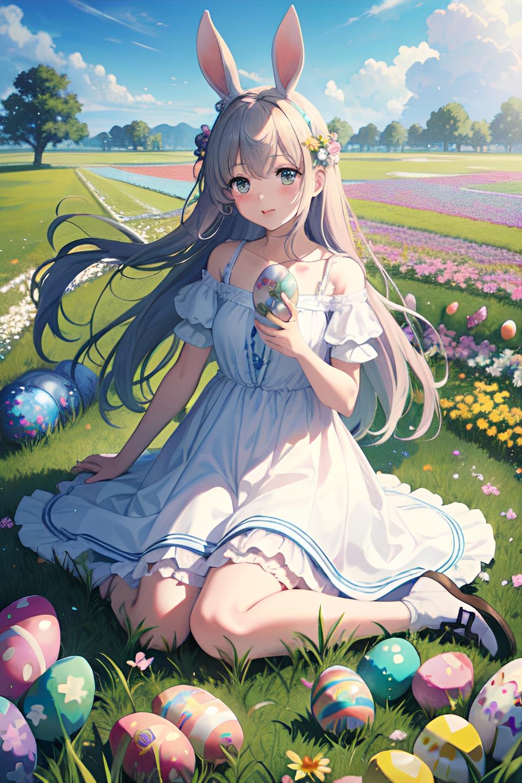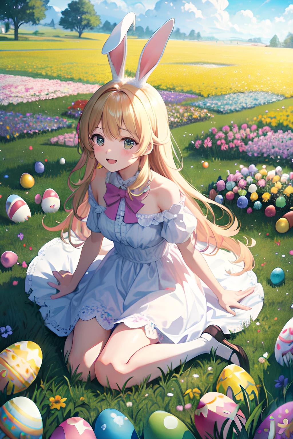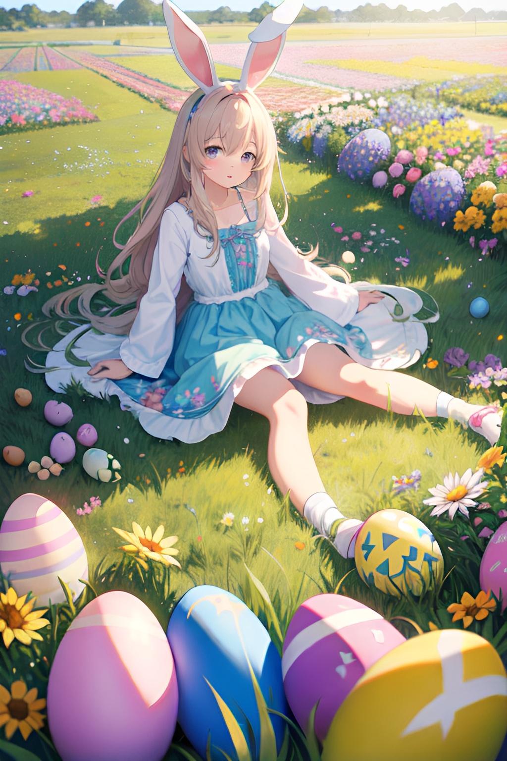 花畑でイースターエッグを集めるウサギ少女