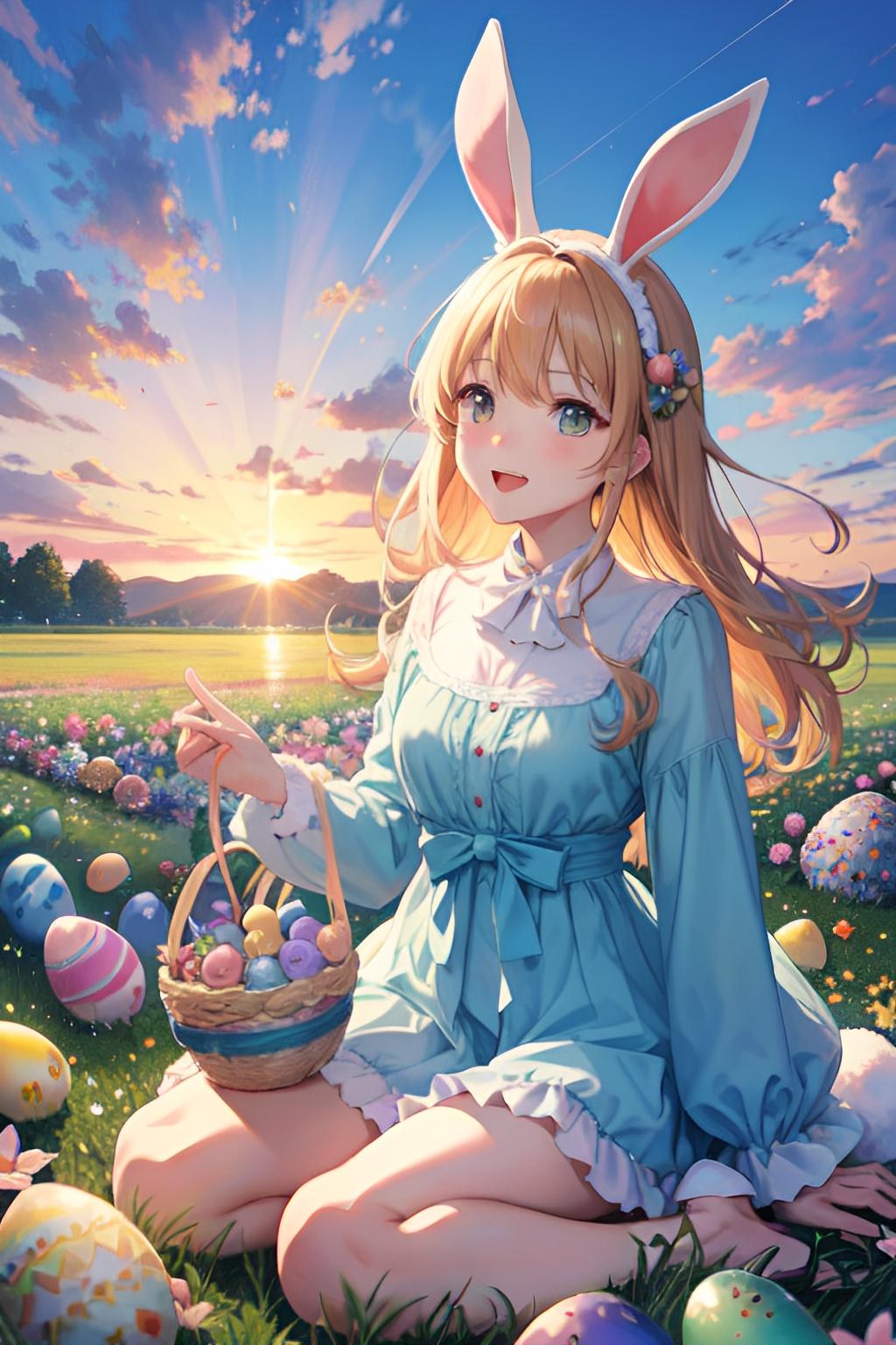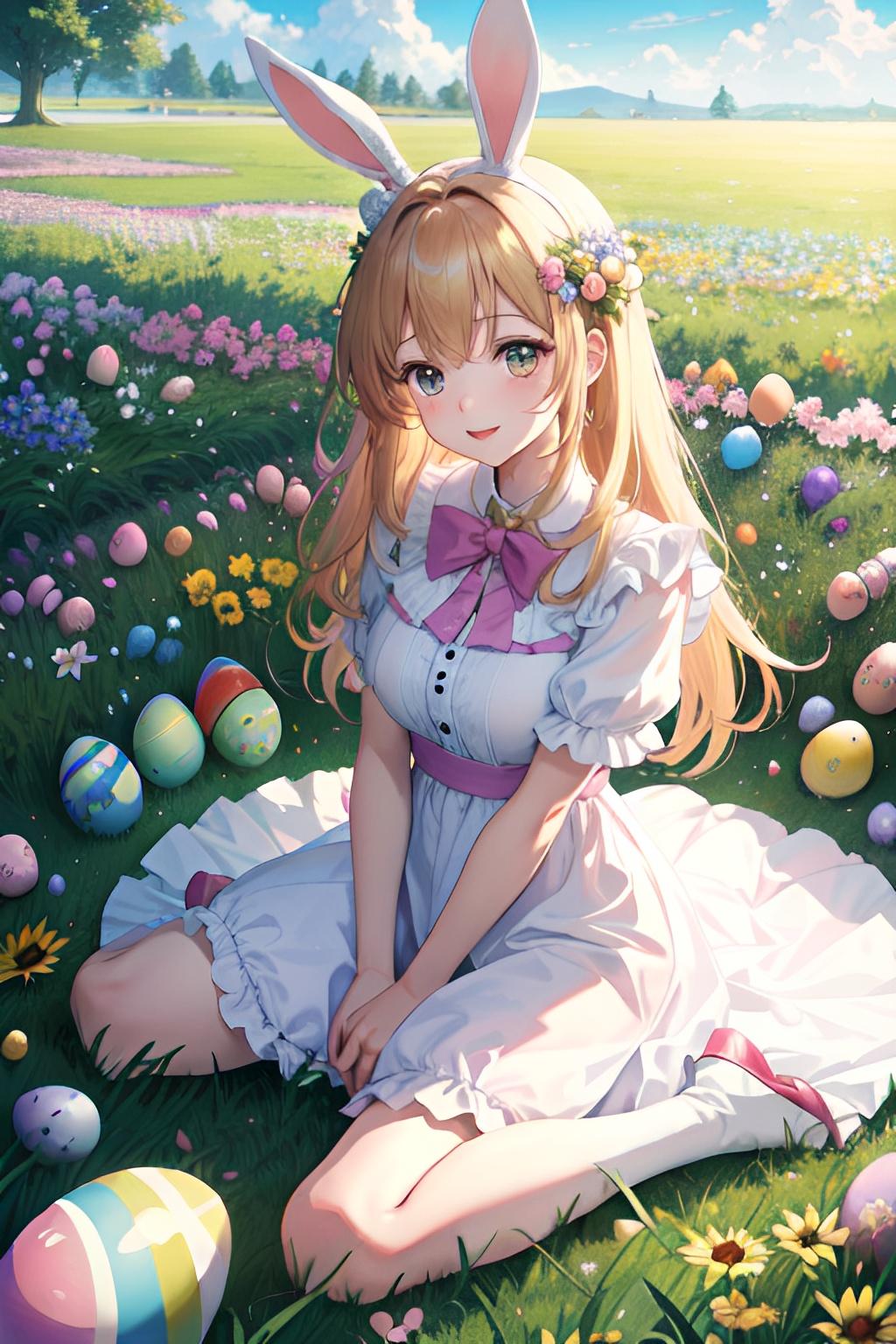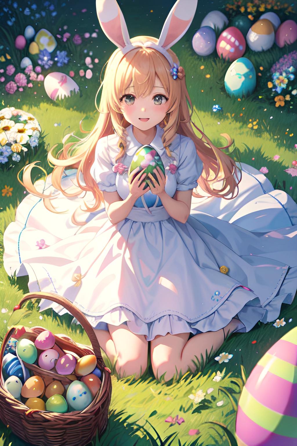 花畑でイースターエッグを集めるウサギ少女