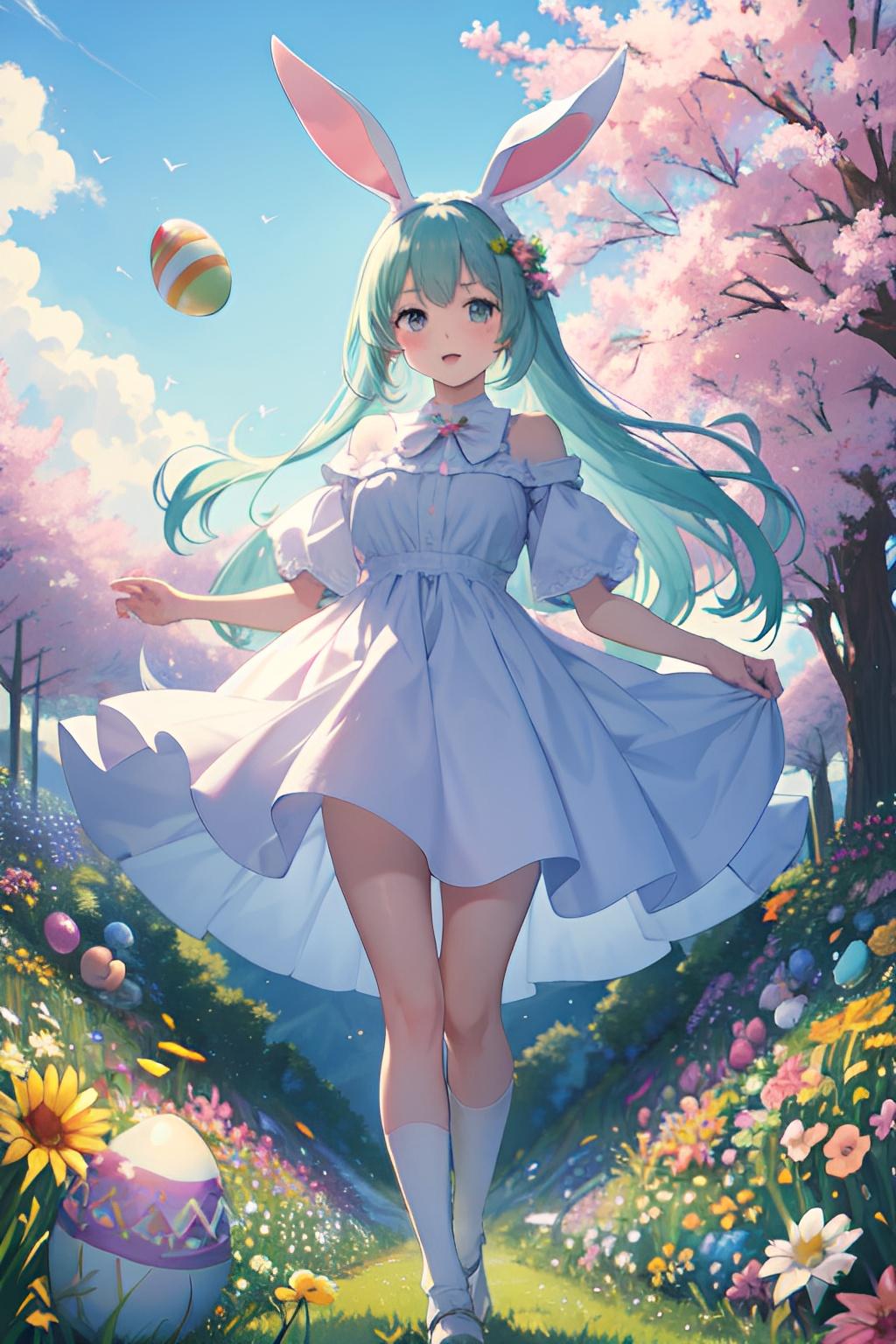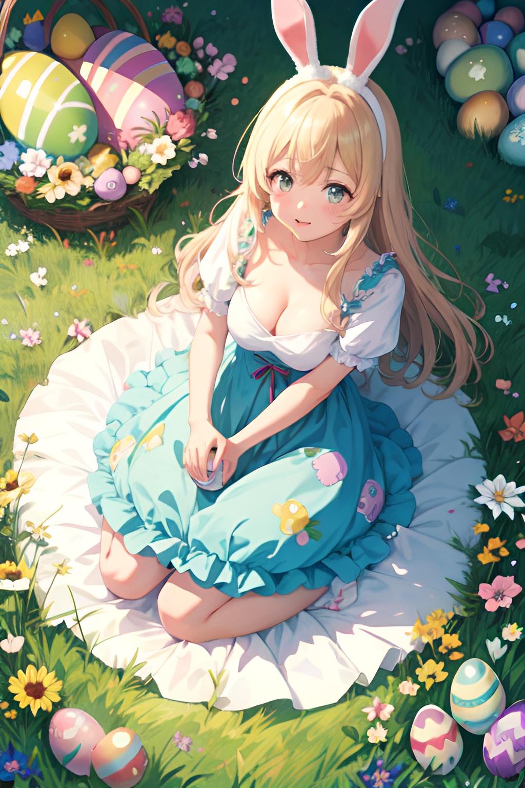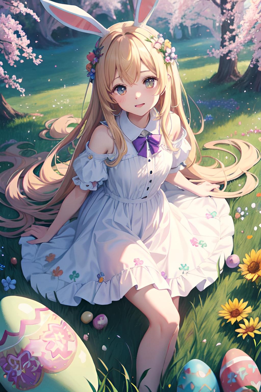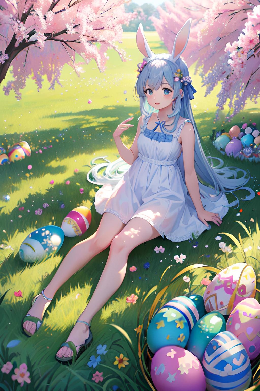 花畑でイースターエッグを集めるウサギ少女