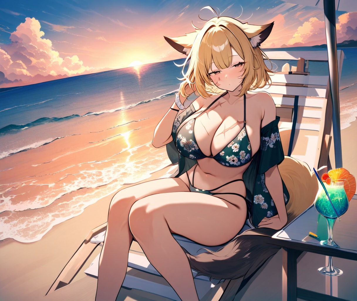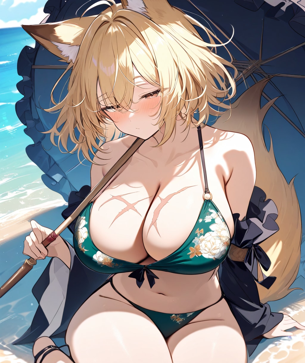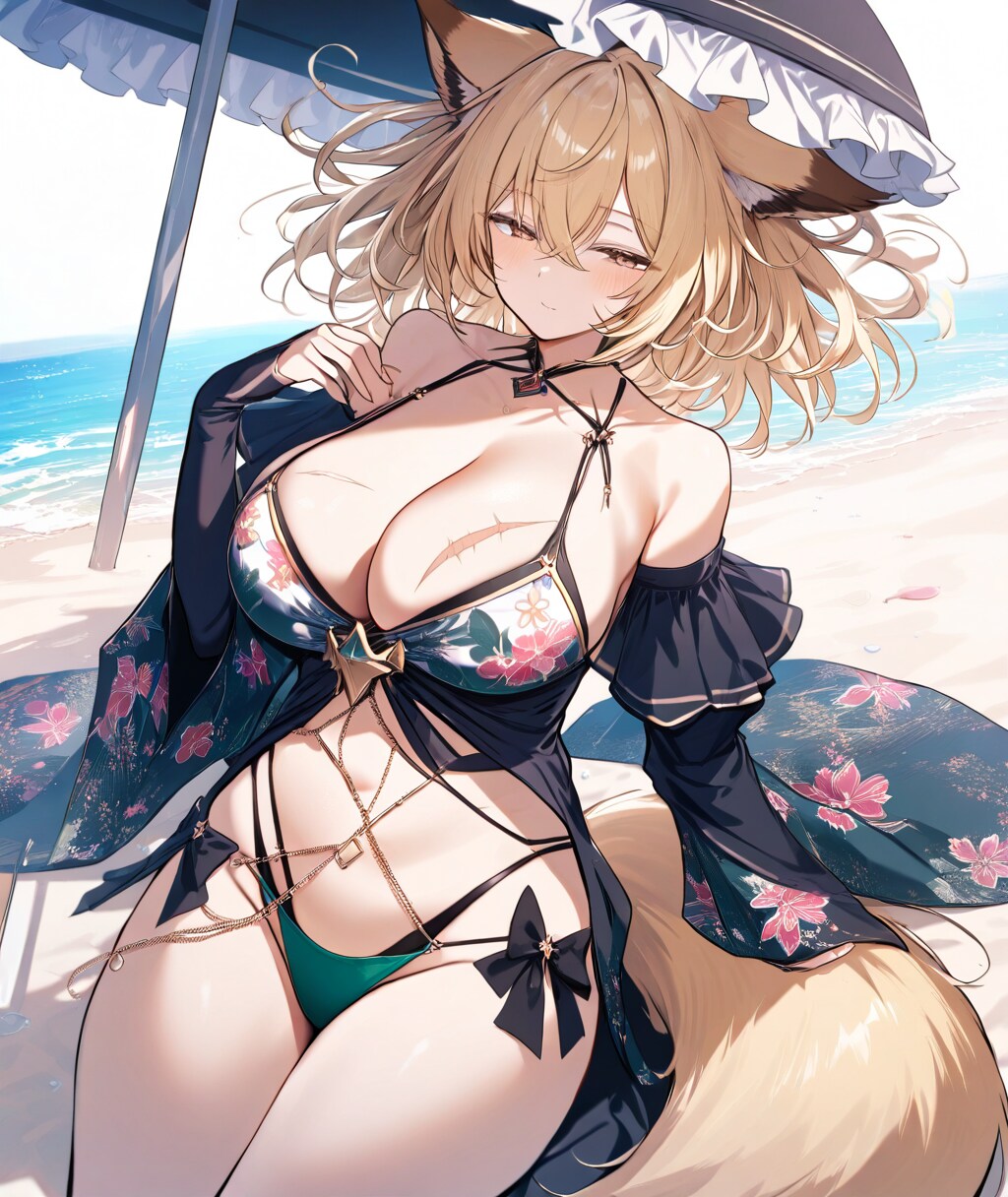 去年の水着企画か何かで構築した『花柄のレイヤードビキニ+フリル付きの着物袖(+ときどき飾りのゴールドチェーン)』が彼女の水着スタイルです。