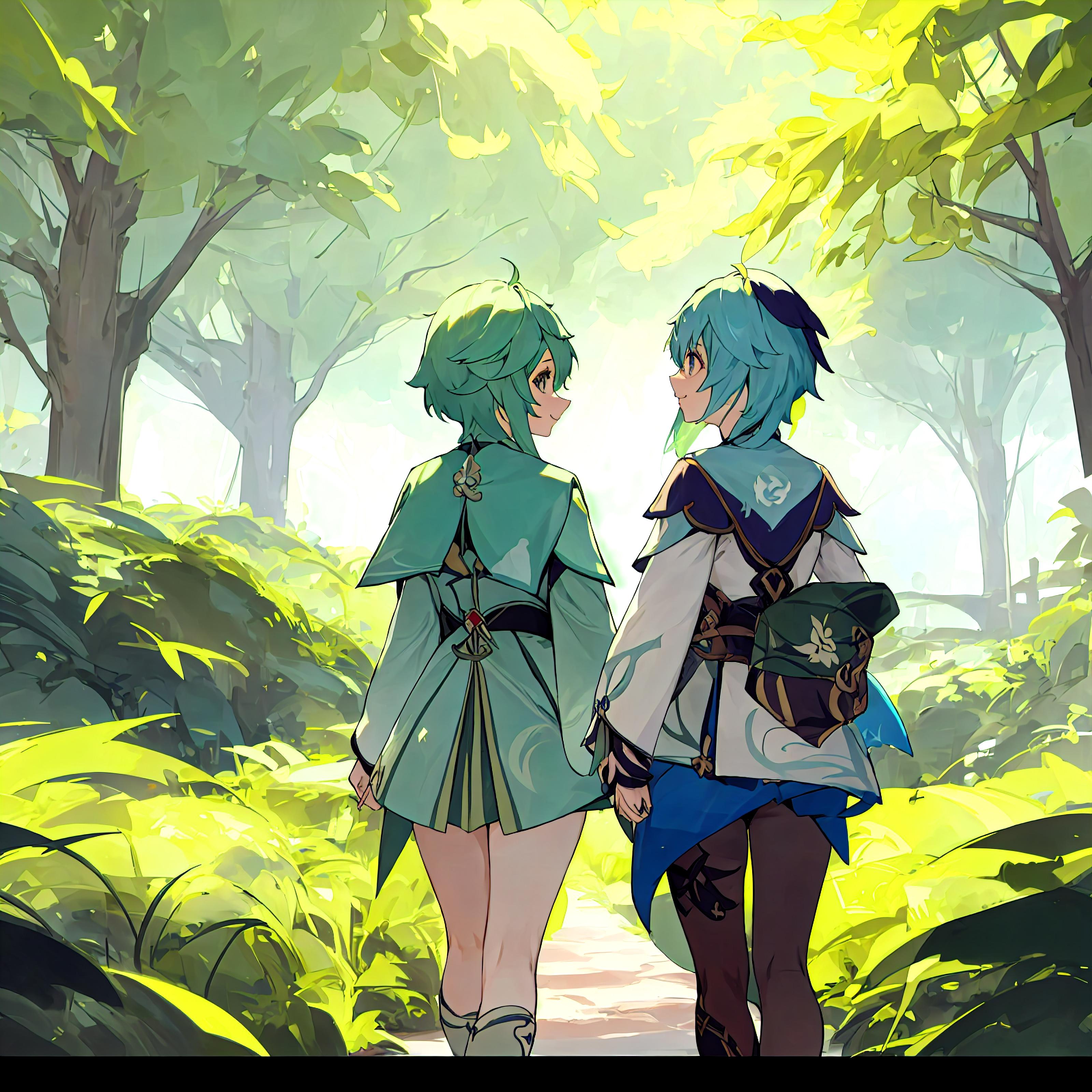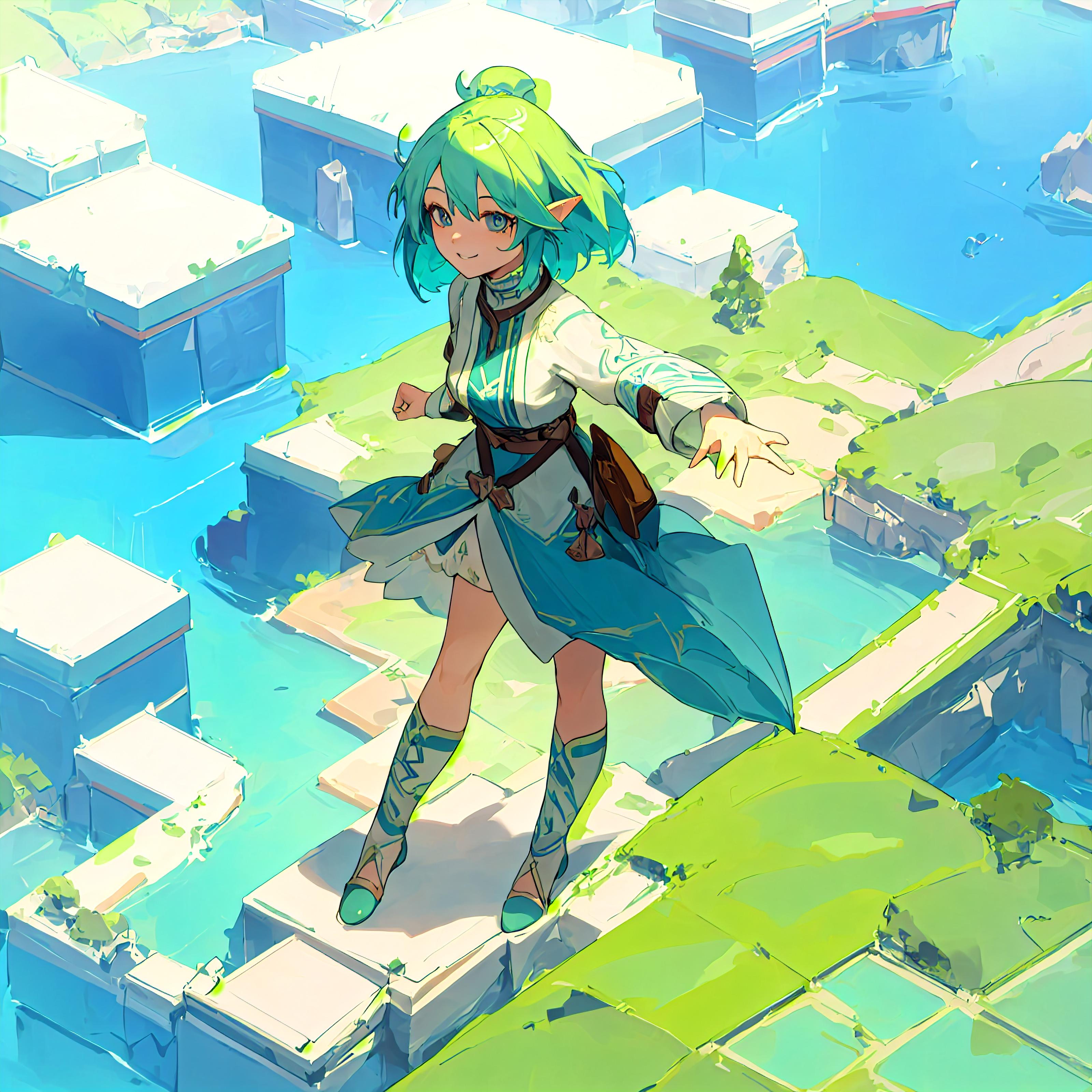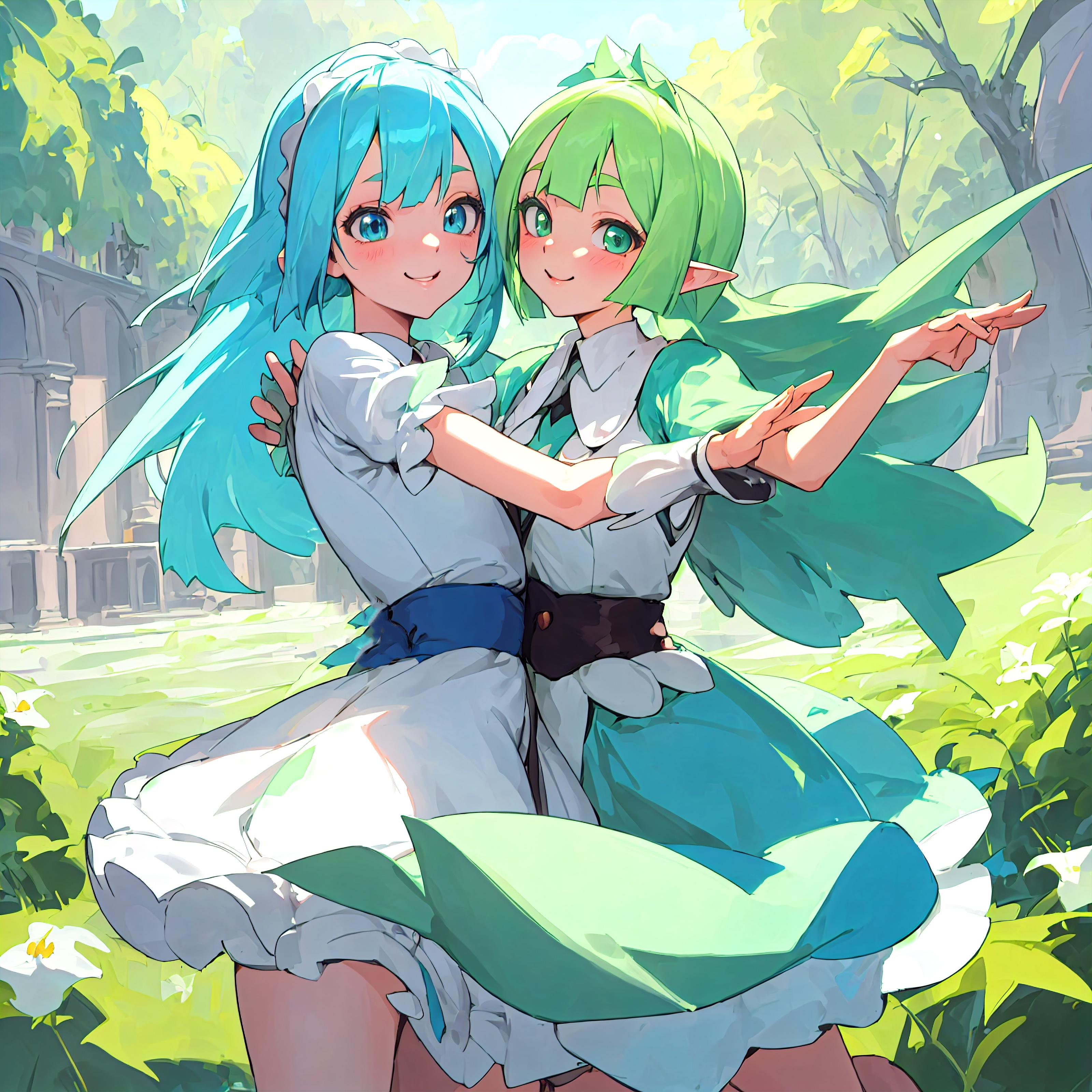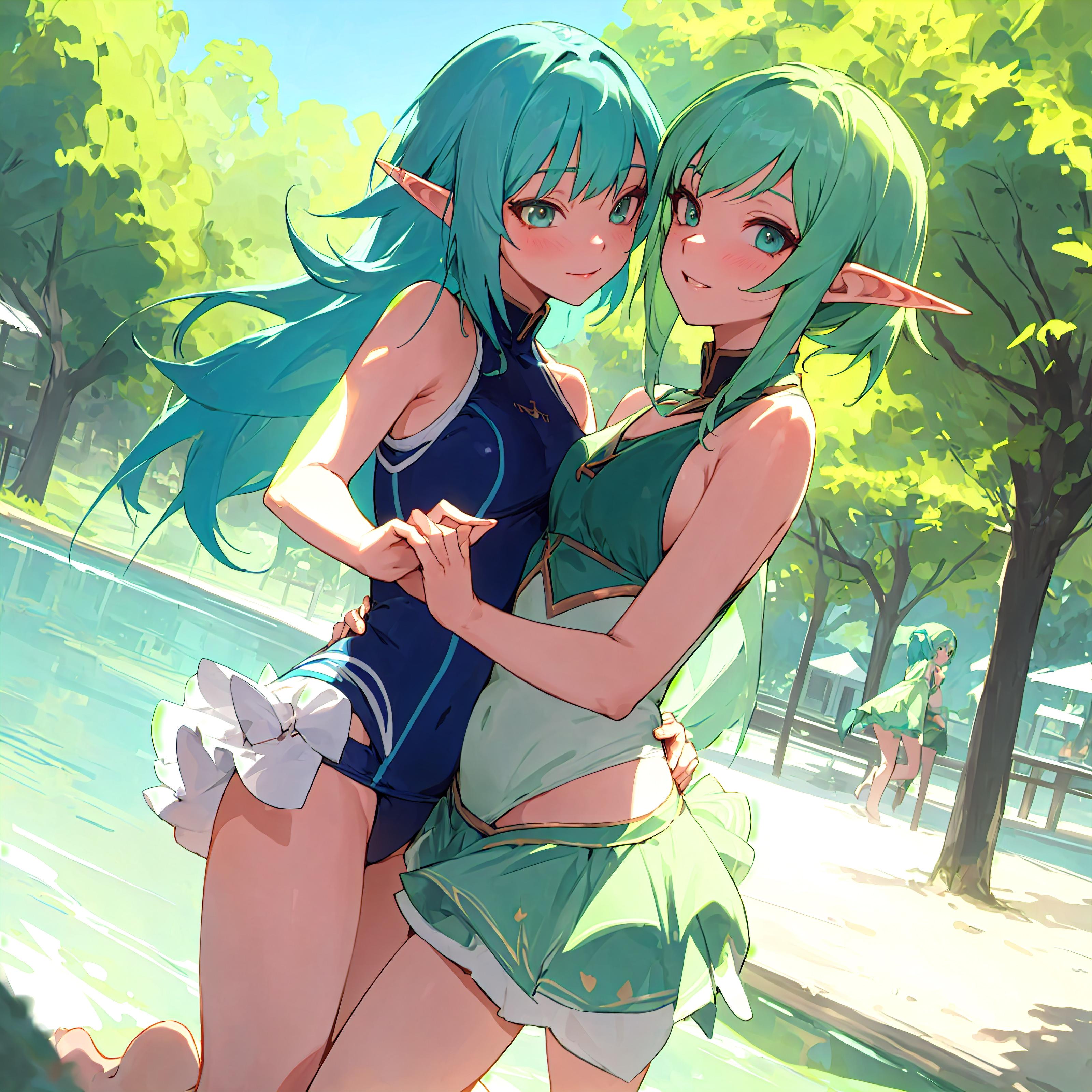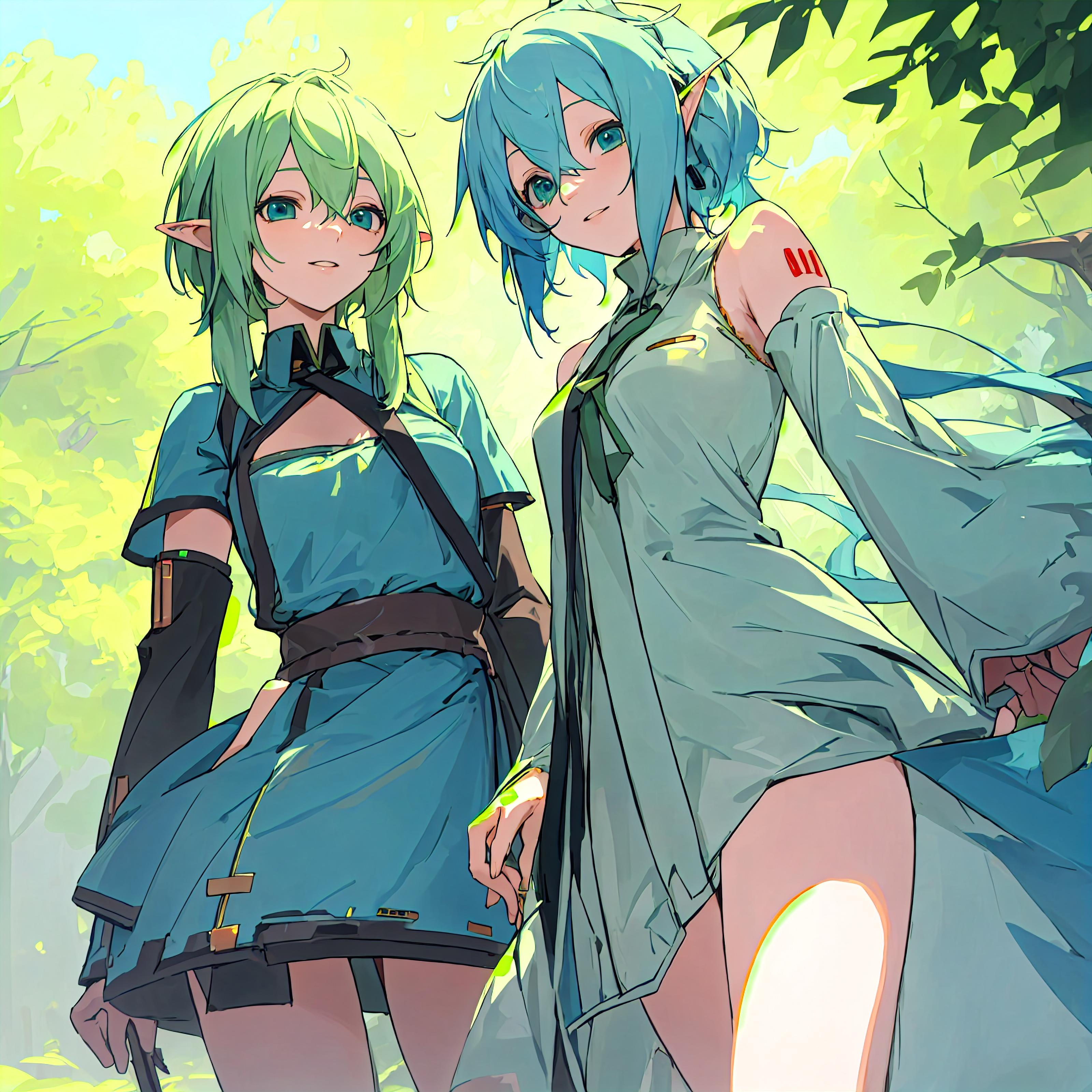 Elven sisters, a blue-haired older sister and a green-haired younger sister, smiling and having adventures.