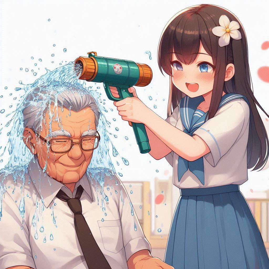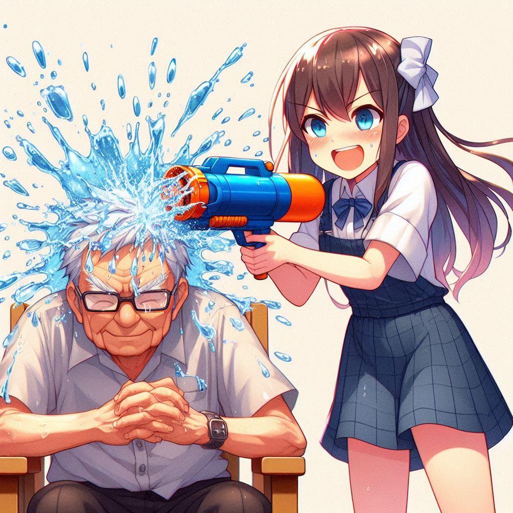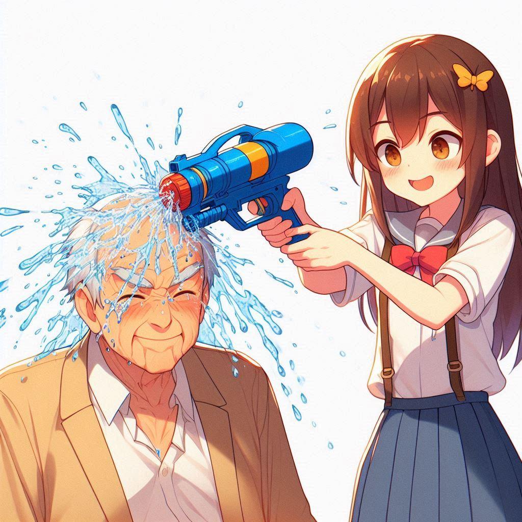 水鉄砲🔫の使い心地を試す女の子のイラストです。