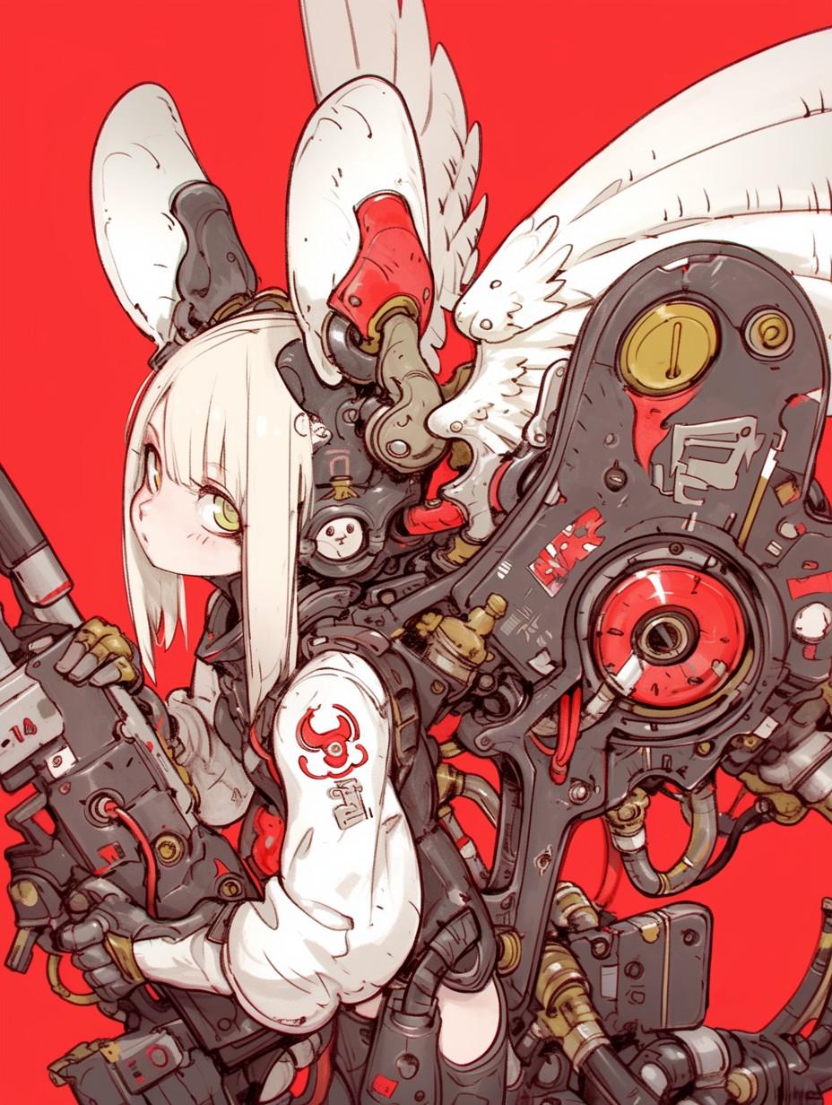 rat ears Girl, kawaii, super fine concept art, hard surface, hawken, mecha, neon lights, mechanical wings