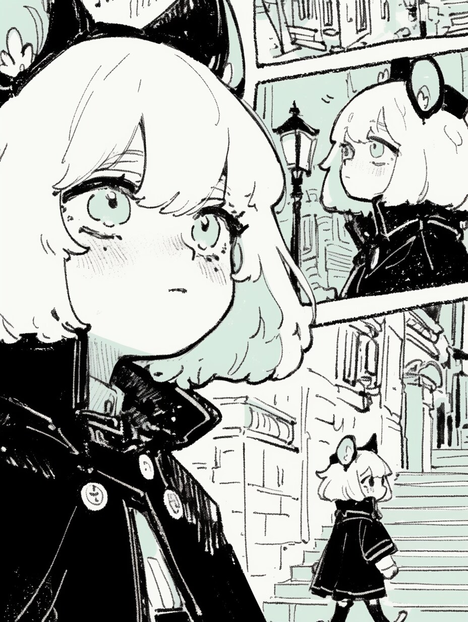 rat ears Girl, kawaii, manga page, multiple panels, bobbed hair, walking school, high detail, high quality, monochrome tones
